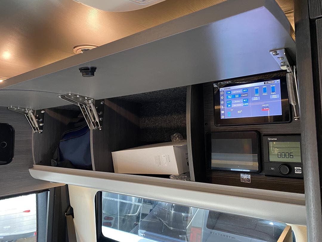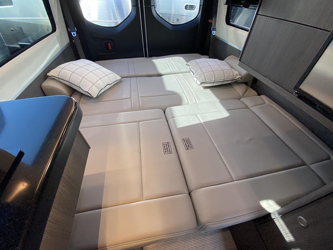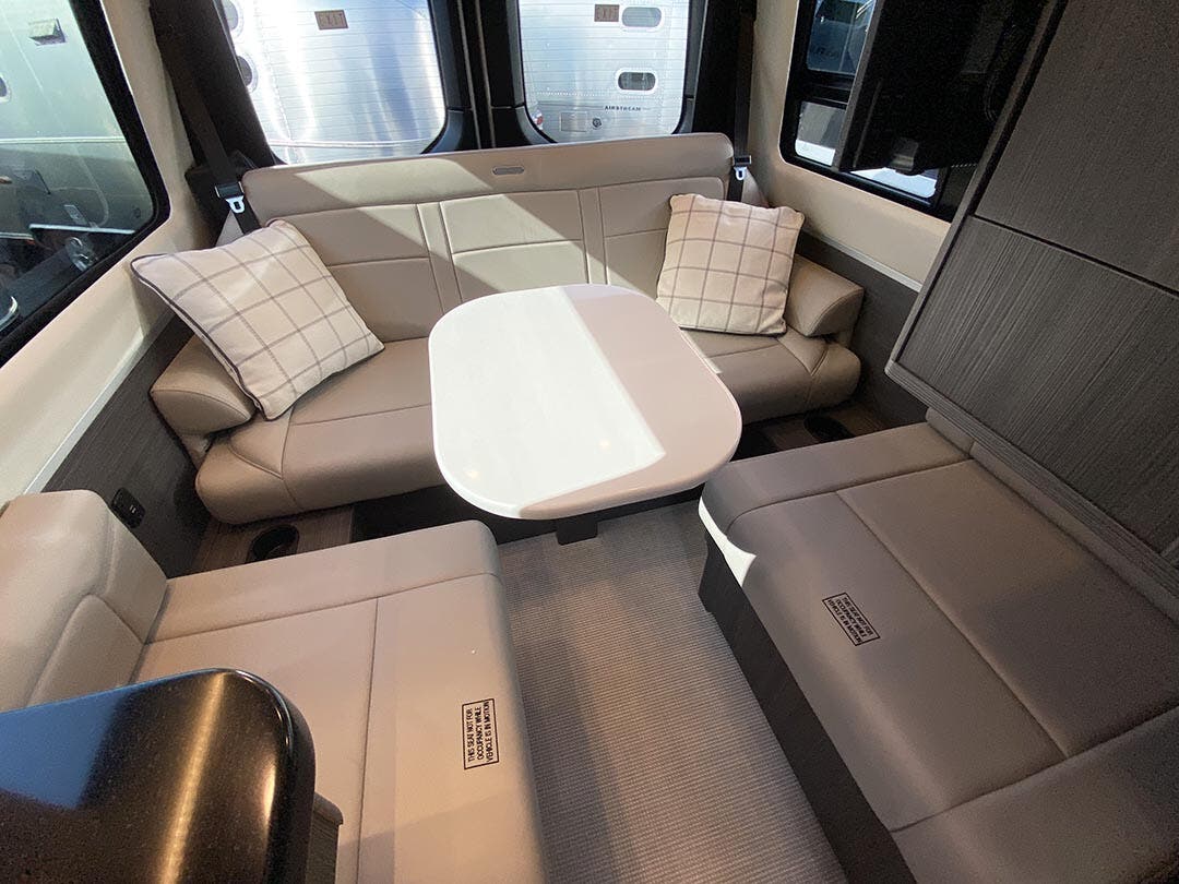Signature Aluminum Ceiling & Trim • Matte Finish Laminate Cabinetry • Flush-Mount & Solid Shut Cabinets • Ultraleather Seating • Vinyl w/Urethane Covering on Walls & Windows • Power Window Shades • Marine Woven Synthetic Flooring • Adjustable LED Lighting • Adjustable Swivel Table (1) • LED Widescreen HDTV • Power Rear Sofa Converts to Lay Flat Bed • Power Ottomans • USB Charging Ports • Fantastic Fan with Rain Sensor • Interior Height 6’ 2.25” • Interior Width 5’ 10”