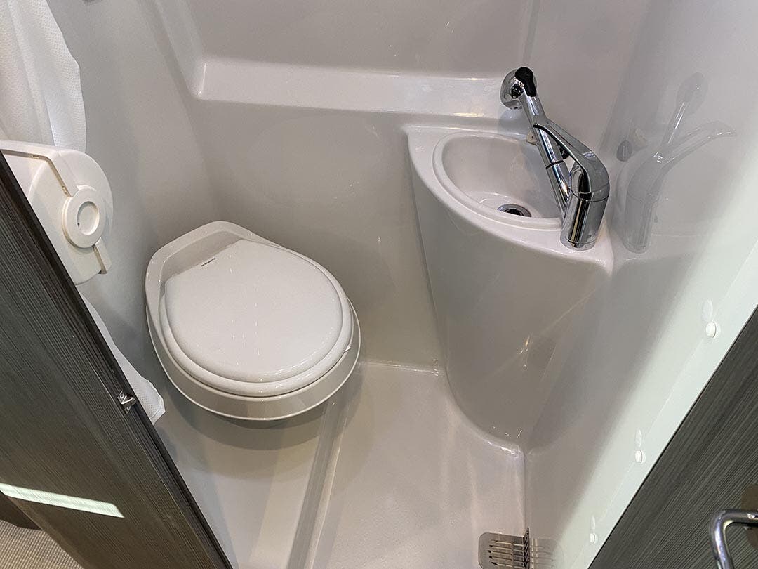Toilet • Shower • Sink with Articulated Mirror • Riveted Aluminum Porthole Door • Retractable Clothes Line • Towel Rack • LED Shower Lights