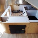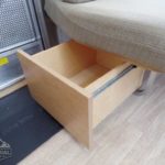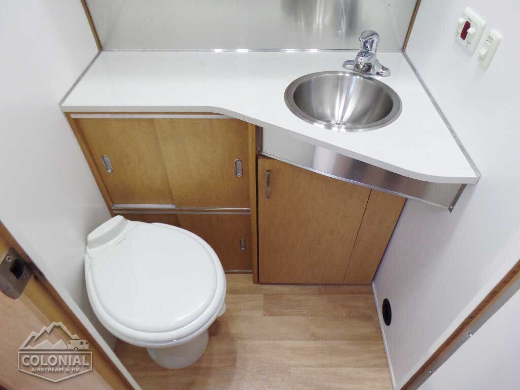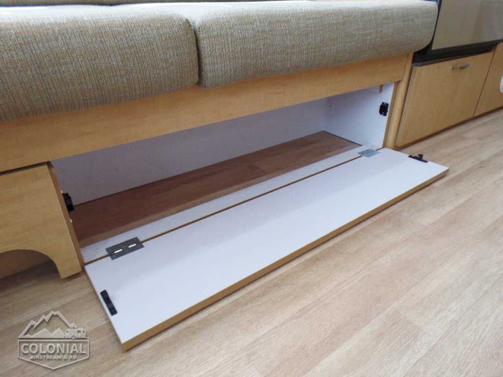 Laminated Galley Top • Galley Flip-Up Shelf • Stainless Steel Sink- Single Bowl w/Cover• Faucet w/Filtration & Separate Sprayer • Magazine Rack • Aluminum Inserts on Refrigerator • 42″ x 76″ Fixed Dinette • Overhead Rooflocker w/Radio at Dinette • Pantry Storage • R.S. Wardrobe • Range Cover • Waste Basket • 66″ Lounge (Sleeping Size 66″ x 46″ • storage Bins Under Lounge • Decorative Throw Pillows.