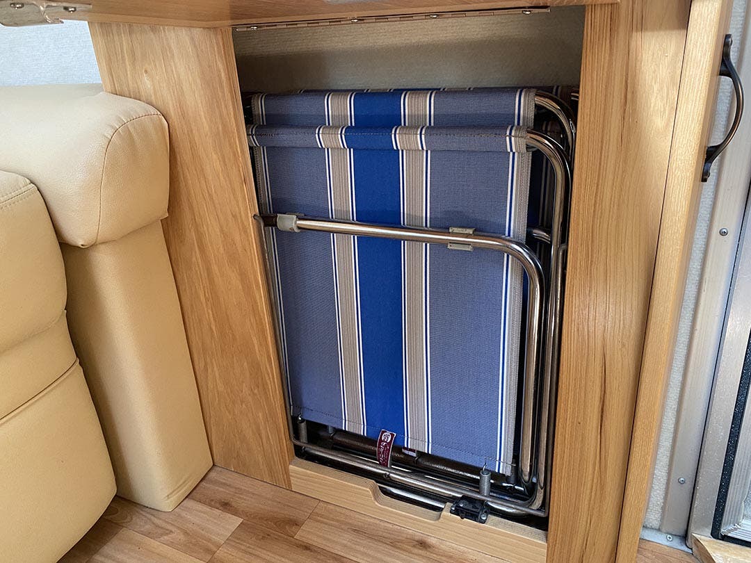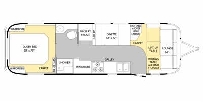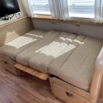 Directional Reading Lights • 74″ Front Lounge (converts to 48″ X 74″ bed) w/R.S. End Table • Blanket Drawer Below Lounge • Resistovar Writing Table w/Zip Dee Chair Storage • Resistovar Lift-Up Table w/Cabinet • Throw Pillows.