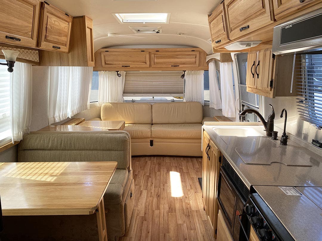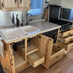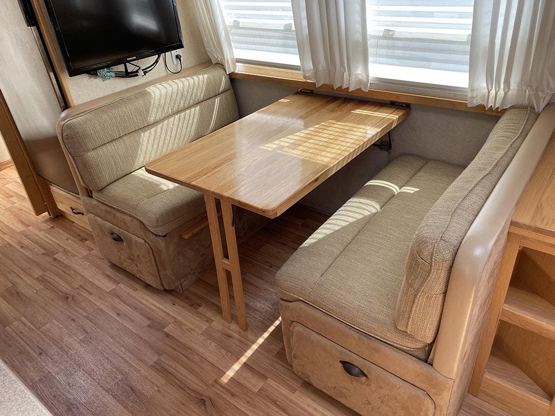 Corian® Galley Top w/Back & End Splash • Spice Rack • Sink w/Double Bowl w/Covers (2) • 42″ x 72″ Fixed Dinette w/Flexilator Style Base • Magazine Rack • Decorative Light On Dinette Rooflocker • Galley Flip-Up Extension • Fluorescent Lighting Under Rooflocker • Oil Rubbed Bronze Pull-Out Faucet w/Soap Dispenser • Oil Rubbed Bronze Water Purifier • Bi-Fold Range Cover • Waste Rack Sack.