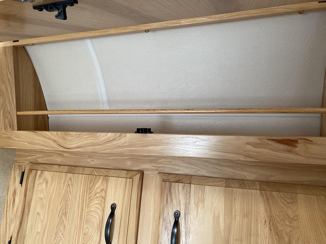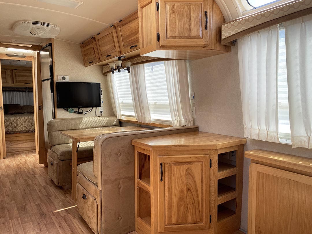 Pleated Day/Night Shades in Galley, Lounge & Dinette (Night Only in Bedroom) • Full Close-Out Drapes in Front Lounge • Hickory Interior w/Raised Panels • Real Wood Drawer Boxes • Rear Overhead Rooflocker w/Reading Lights • Fabric Covered Interior Skin • Vinyl Covered Soft Ceiling • Entrance Mat • Fabric Valances • Zip Dee Chairs (2) • Wainscot & Baseboards at Select Locations • Hickory Hardwood Threshold • Grab Handle Assist • Wood-grain Vinyl Flooring – Galley & Bath • Resistovar Tops (Credenza, Writing & Dinette Tables) • Oil Rubbed Bronze Hardware.