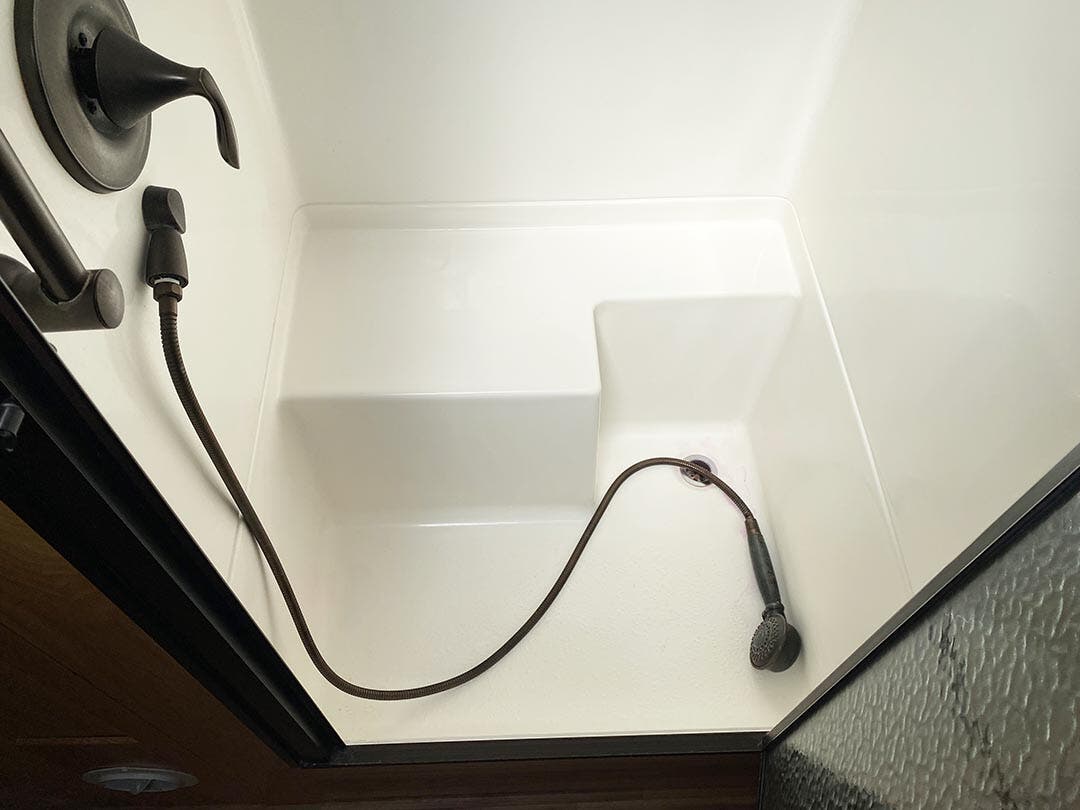 Towel Bars (2) • Towel Ring • Corian® Lavatory Top • Oil Rubbed Bronze Bath Accessories • Oil Rubbed Bronze Frame Shower Door • Large Medicine Cabinet Above Sink • Fiberglass Shower • Shower Light • Liquid Soap Dispenser at Lavatory • China Toilet.