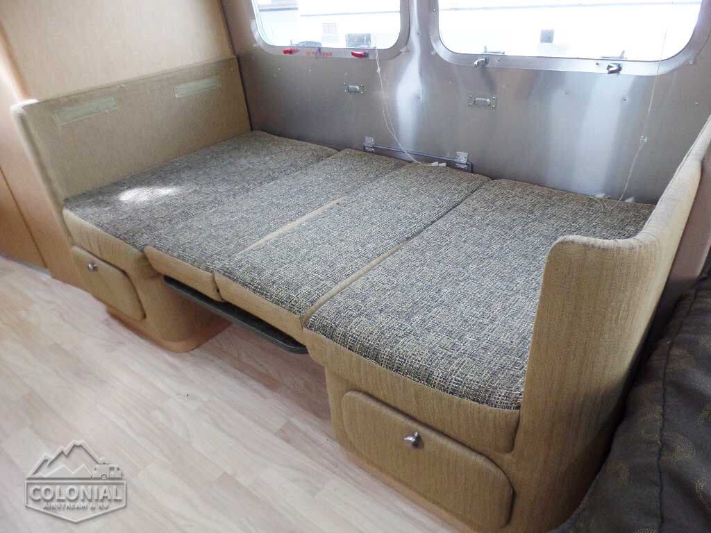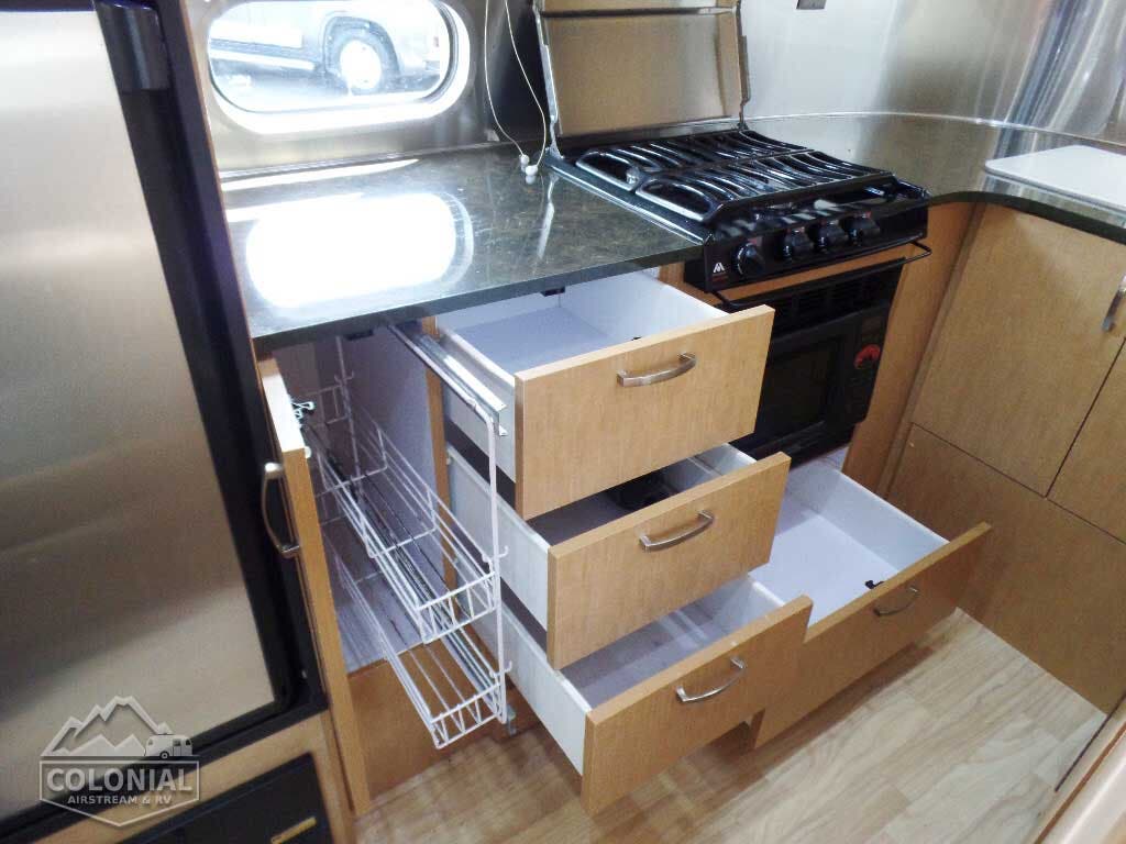 Laminated Galley Top • S.S. Double Bowl Sink w/Covers (2) • Faucets w/Filtration & Separate Sprayer • Aluminum Inserts on Refrigerator • Overhead Rooflocker w/Radio & Dinette • Fixed Dinette 38″ x 76″ • Pantry Storage • Bi-Fold Range Cover • Waste Basket.