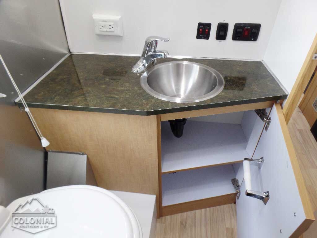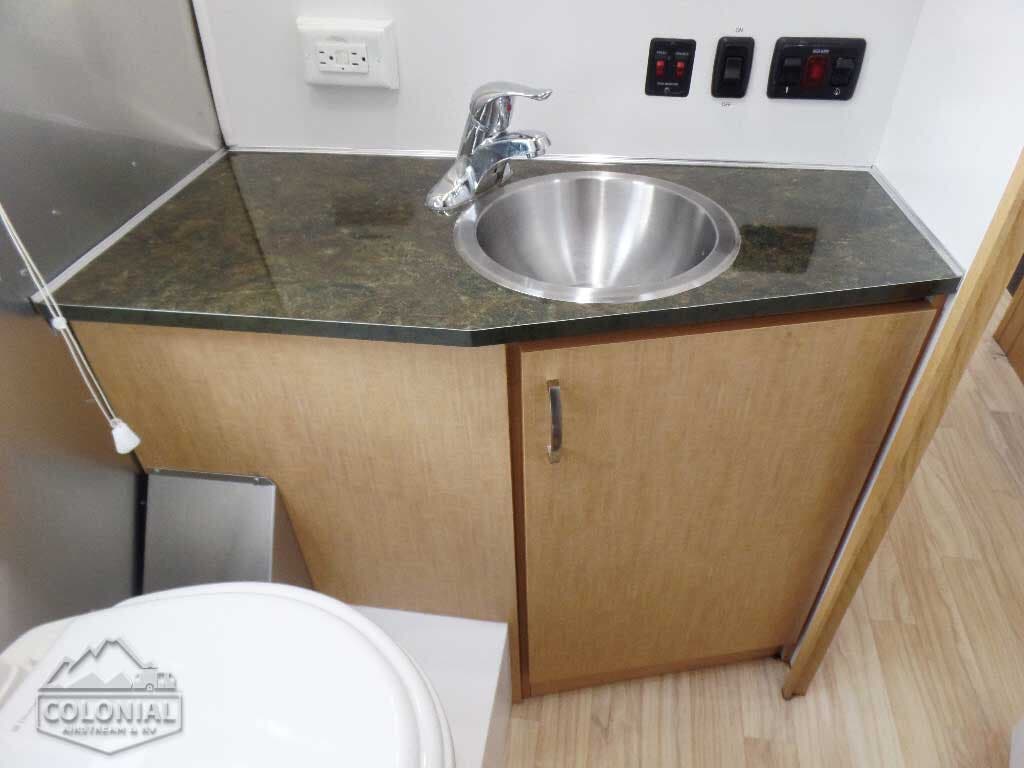 30 Lb. Steel LPG Bottles w/o Gauges (2) • Automatic 2-Stage Regulator • Shower Head w/Shut-Off • Water Pump 4 GPM • Water Heater By-Pass Kit • Lockable Water Fill • Water Pressure Regulator • Toilet • 23 Gallon Fresh Water Tank w/Drain Valve • 18 Gallon Black Water Tank • 21 Gallon Grey Water Tank • Exterior Height w/AC – 9′ 5″ • Interior Height – 6′ 4.5″ • Exterior width – 8′ • Interior Width – 7′ 7″ • Exterior Length – 20′ 10″ • Hitch Ball Height -17 3/4″ • Safety Chain Hook 11,700# Rating • Sewer Hose Storage Tube • Heated Tanks- 12 Volt • No Fuss Tank Flush System.