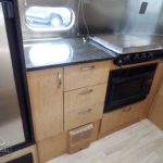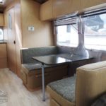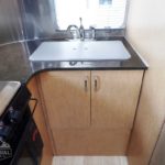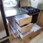 Laminated Galley Top • S.S. Double Bowl Sink w/Covers (2) • Faucets w/Filtration & Separate Sprayer • Aluminum Inserts on Refrigerator • Overhead Rooflocker w/Radio & Dinette • Fixed Dinette 38″ x 76″ • Pantry Storage • Bi-Fold Range Cover • Waste Basket.