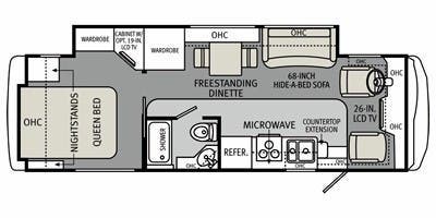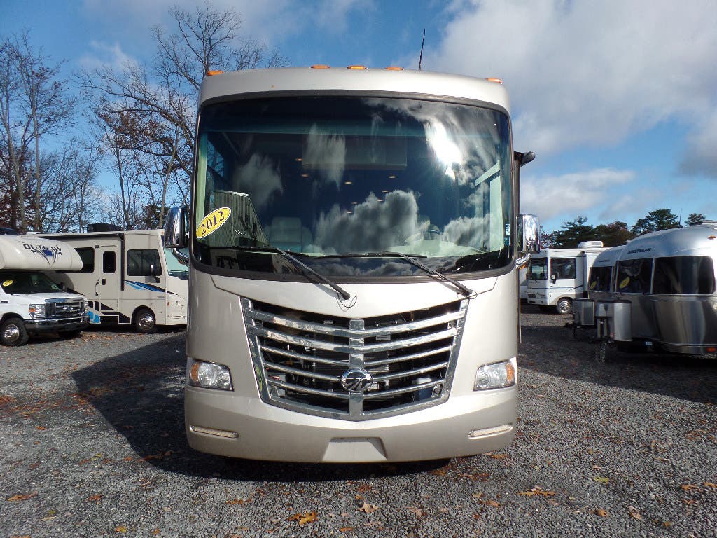Model: 2012 – Monaco La Palma 30SFS Weights Gross Vehicle Weight Rating (Lbs.) 18,000 Gross Combined Weight Rating1 (Lbs.) 23,000 Front Gross Axle Weight Rating (Lbs.) 7,000 Rear Gross Axle Weight Rating (Lbs.) 12,000 Measurements Wheelbase: 190″ Overall Length: 31′ 5″ Overall Height with AC: 12′ 3″ Exterior Width: 100.5″ Interior Height: 80.5″ Tank Capacities Gray Tank (Gal.) 40 Black Tank (Gal.) 40 Fresh Tank (Gal.) 75 Fuel Tank (Gal.) 80 LP Tank3 (Lbs./Gal.) 68/16 Body construction› Laminated Sidewall Construction › High Gloss Fiberglass Exterior Walls › Laminated Structure Floor w/ Block Foam Insulation › Peaked One-Piece Fiberglass Roof › Front Molded Fiberglass Cap w/ One-Piece Windshield › Large Chrome Front Grille › Deluxe Black Exterior Mirrors › Rear Molded Fiberglass Cap › Flush-Mount Baggage Doors w/ Slam-Latch Doors › 1-Piece Pass-Through Storage Comp. (30SFS, 36DBD) › Exterior Mega Storage Under Bed (N/A 36DBD) › Molded ABS Fenders › Rear Wheel Mud Flaps › Vinyl Graphics Package › Automatic Electric Exterior Entrance Step › Rear Ladder › Undercoating FORD CHASSIS / ENGINE / SUSPENSION› 6.8L Triton® V-10 Gasoline Engine w/ Electronic Fuel Injection; 6.8L 415 cu. in.; 362 HP @ 457 lbs./ft. Torque › 5-Speed TorqShift® Automatic Overdrive Transmission with Tow/Haul Mode › Transmission Oil Temperature Gauge › 130 Amp Alternator › Rear Axle Ratio 4.88:1 (N/A 36DBD) › Rear Axle Ratio 5.38:1 (36DBD) › Radial Tires (225/70R/19.5F) w/ Stainless Steel Wheel Liners w/ Valve Extenders (N/A 36DBD) › Radial Tires (235/80R/22.5G) w/ Polished Aluminum Wheels (36DBD) › Rear Multi-Leaf Spring Suspension › Front and Rear Disc, 4-Wheel Anti-Lock Brakes › Heavy Duty Front Track Bar with Bilstein Shock Absorbers › Automatic Hydraulic Leveling Jacks › 5,000 lb. Hitch Receiver w/ Dual Connector, 4-Pin or 7-Pin › One 12V Chassis Battery › Battery Boost Start Switch Cockpit› Automotive Dash with Oxford Burl Instrumentation Panel › Side Console for Pilot and Co-Pilot Seats w/ Cup Holder, Storage Pod and 110V Outlets › Full Width Power Front Shade w/ Pull-Down Side Shades › In-Dash 7” Touch Screen AM/FM/CD Stereo Radio; Sirius Satellite Ready w/ SD Card Slot, USB Port for MP3 Player/Flash Drives and Weather Band › Back-Up Camera Monitor with DVD Player › Recessed Pilot/Copilot Map Lights › New Leatherette Pilot and Co-Pilot Cockpit Recliner Seats Appliances and Accessories› Double-Door Refrigerator › 3-Burner Cooktop w/ Glass Top and Half-Time Oven › Lighted Power Range Hood › 32” LCD TV in Front Cockpit Overhead (30SBD, 30SFS) › 32” LCD TV in Main Living Area (36DBD) › 26” LCD TV at Dinette (32SBD) › 19” LCD TV Bedroom › Hallway Bunks: 2 Fold-Down DVD Players, Game HookUps and Light at Each Bunk (32SBD) › TV Antenna and Dash Stereo Antenna › Cable TV and Satellite Dish Prep INTERIOR› Hillside Cherry Cabinetry › New Style Doors and Drawers › Black Smoked Refrigerator Door Inserts › Accent Wall Paneling in Slide-Outs and Bedroom End Wall › Wallpaper Border in Bath › Heavy Duty Ball Bearing Drawer Guides › Solid Surface Kitchen Countertop and Backsplash › Solid Surface Kitchen Counter Extension › Kitchen Pantry w/ Full Height Wire Roll-Out (32SBD) › Wood Grain Laminated Dinette Top › Bath Laminate Countertop with Stainless Steel Sink › Linoleum Flooring Throughout Except Cockpit, Bedroom › Carpeting with Pad in Cockpit, Slide-Outs and Bedroom › Soft Touch Padded Vinyl Ceiling › New Hardwood Slide-Out Fascia › TV Cabinet in Bedroom › Two Decorative Sofa Pillows in Living Area › Hardwood Headboard w/ Fabric Insert, Bedspread with Reverse Sham and Decorative Pillow › Solar Shade and Room Darkening Roller Shades in Living Area and Cockpit › Darkening Roller Shades in Bedroom Furniture› Queen Bed Innerspring Mattress › Hallway Bunks w/ 3-Drawer Storage, Railing and Ladder (Bunks Can Fold Up for Wardrobe) (32SBD) › Curbside; Leatherette Jackknife Sofa (32SBD) › Roadside; Leatherette Hide-A-Bed Sofa (30SBD, 30SFS) › Roadside; Leatherette Expand. Jackknife Sofa (36DBD) › Fabric Booth Dinette w/ Adj. Table Top (30SBD, 36DBD) › Curbside; Leatherette Bench Seat Booth Dinette w/ Cup Holders (32SBD) › Free-Standing Dinette w/ 2 Free-Standing Chairs and 2 Folding Chairs (30SFS) Electrical systems and lights› 50 Amp 120V Distribution Panel (32SBD, 36DBD) › 30 Amp 120V Distribution Panel (30SBD, 30SFS) › 55 Amp Electronic 12V Power Converter › Onan® 5.5 kW Gas Generator (32SBD, 36DBD) › Onan® 4.0 kW Gas Generator (30SBD, 30SFS) › 12V Auxiliary Battery › Coach Battery Disconnect Switch › Porch Light / Security Light › Automatic Electric Exterior Entrance Step w/Light › Water Pump Switch in Convenience Center › Lights in Outside Storage Compartments › Halogen Ceiling Lights › Satin Nickel Swivel Bullet Lights in Living Area, Bedroom › Battery Maintainer PLUMBING AND LP SYSTEMS› Single Lever Kitchen Faucet with Pull-Out Sprayer › Stainless Steel Bathroom Sink › Polished Chrome Bath Faucet with Single Handle › 12V Demand Water System and Water Pump › Girard Energy Efficient Tankless Hot Water Heater w/ Unlimited Supply of Hot Water › Exterior Shower › China Bowl Toilet › Macerator Toilet (36DBD) › 4-Way Fresh Water Valve for City Water, Tank/Standard Fill and Winterization › Contained Storage Area for Sewer Hose › Exterior Utility System › Insulated Systems Compart. w/ Easy Access › Shower Faucet w/ Hose and Head w/ Shut-Off › Neo-Angle Shower w/ Glass Door (30SBD) › Rectangle Shower w/ Glass Door (N/A 30SFS) HEATING, VENTS AND AIR CONDITIONING › Living Area Single 13.5M BTU AC w/ Ducted Air › 31M BTU Electronic Ignition Furnace (30SFS) › 35M BTU Electronic Ignition Furnace (N/A 30SFS) › Electronic Dash AC/Heat Climate Control System › Kitchen Non-Powered Roof Vent › Center 