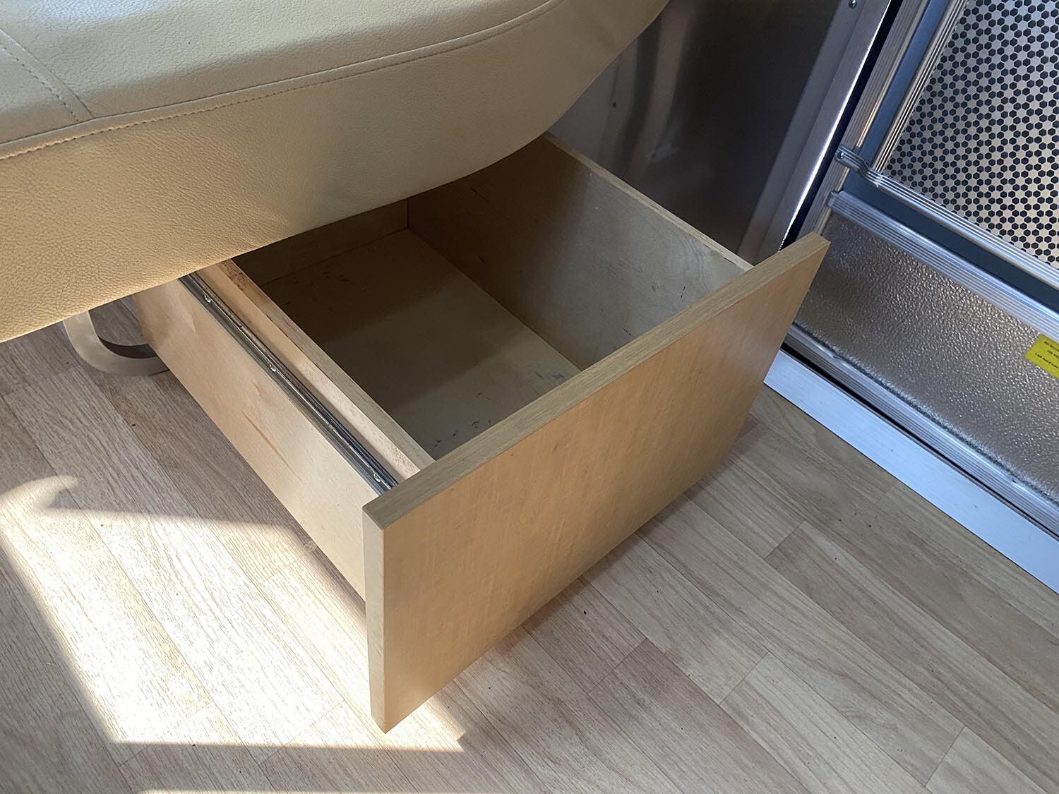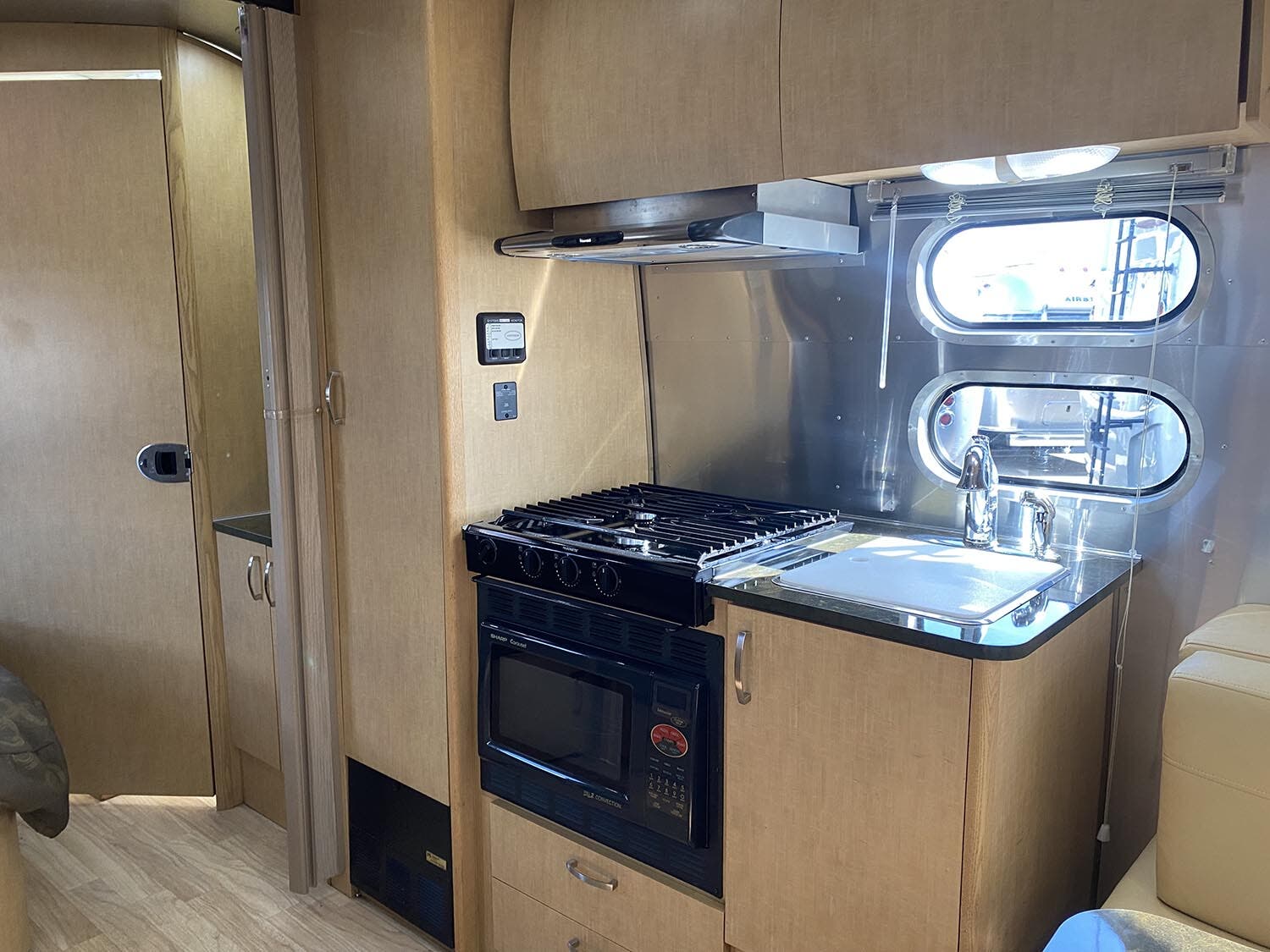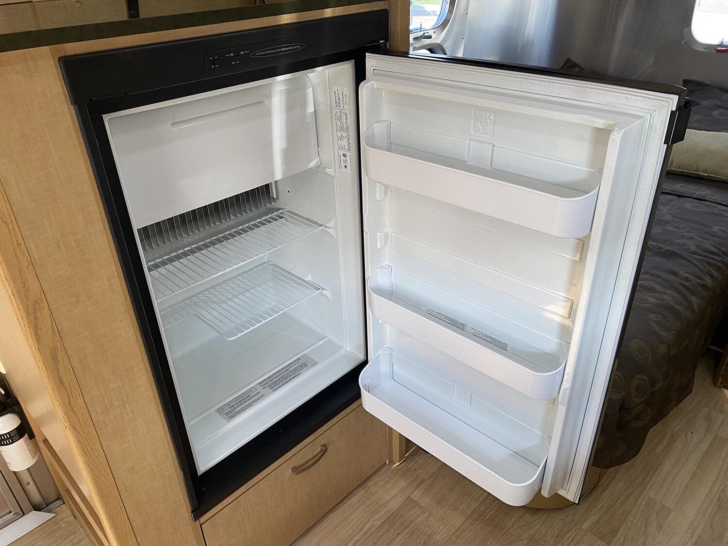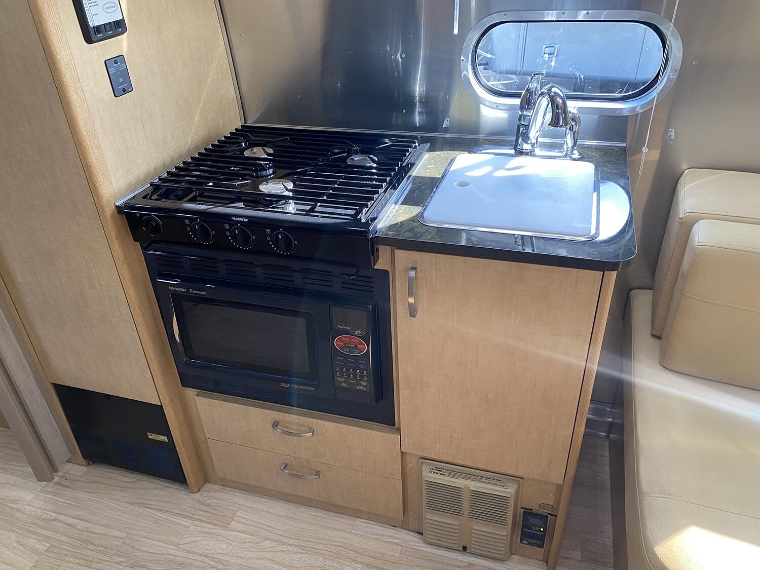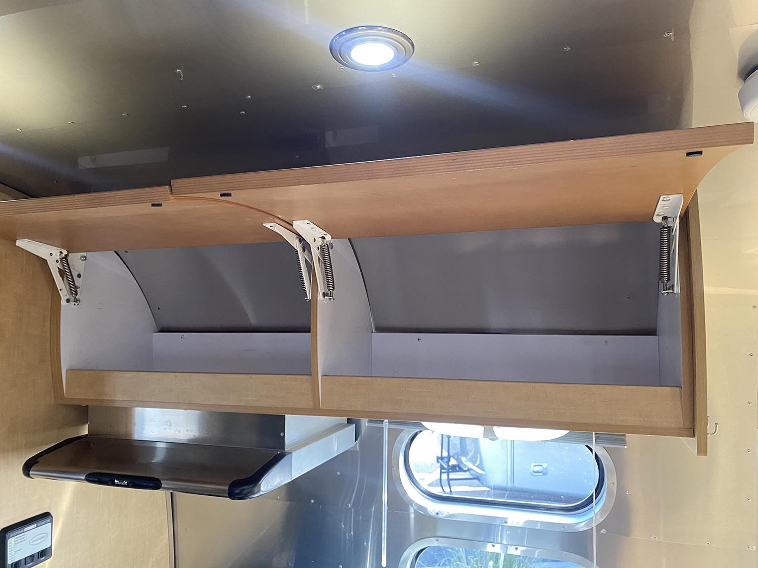 Brushed Aluminum Mini Blinds on All Windows Except Drapes on Front Panoramic Windows • Bright Aluminum Finish Interior Skin • Wood/Steel Drawer Boxes • Overhead Rooflocker With Radius Doors • Entrance Mat w/Airstream Logo • Laminate Furniture & Countertops • Interior Grab Handle • Seamless Vinyl Flooring Throughout • Satin Finish Hardware • 5 Hook Key Holder • LED Ceiling Lights • Magazine Rack (N/A 27′).
