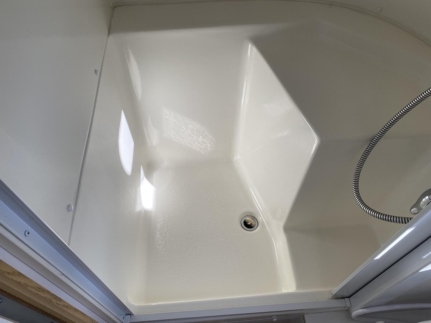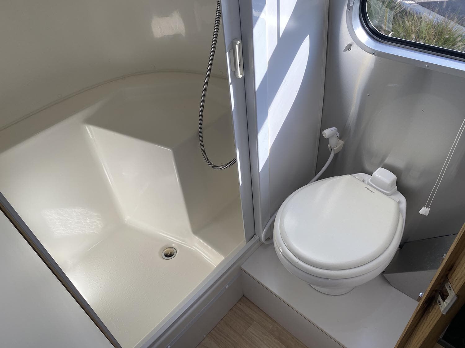 Towel Bar and Ring • Hinged Bath Door w/Window • Retractable Clothes Line in Shower • Stainless Steel Round Lavatory Sink • China Toilet.