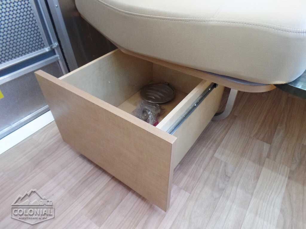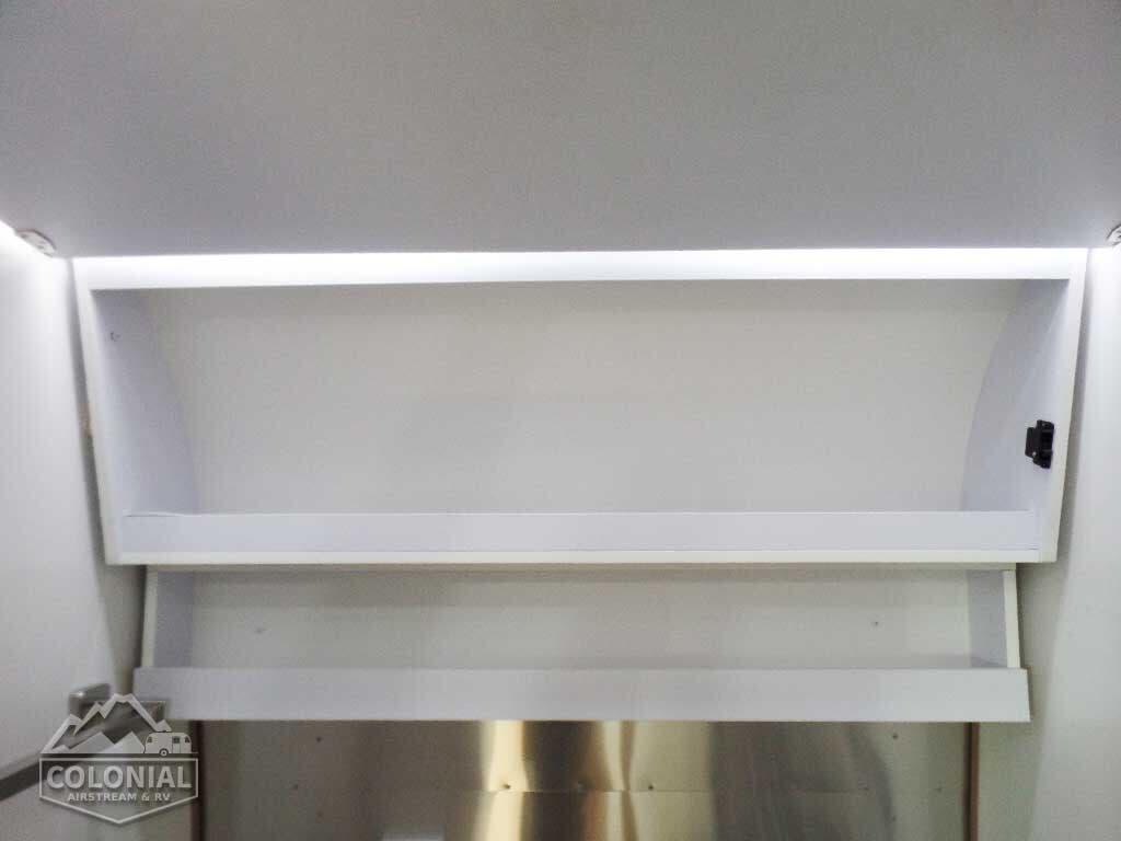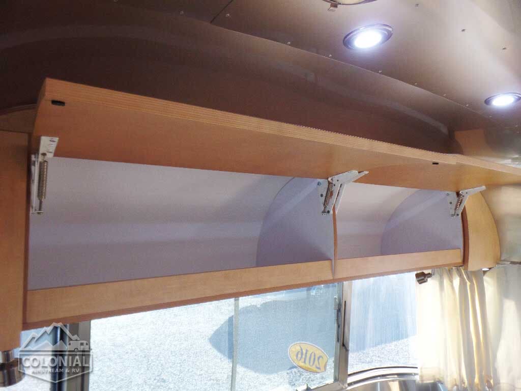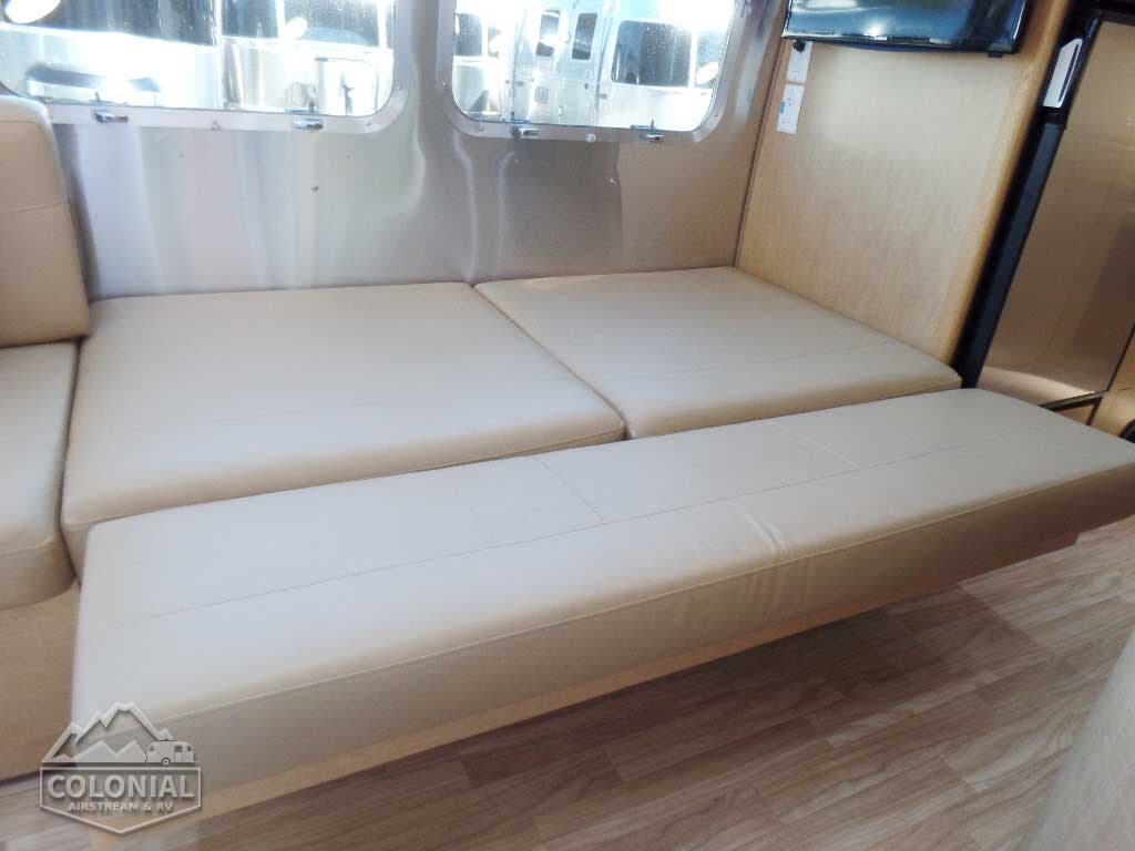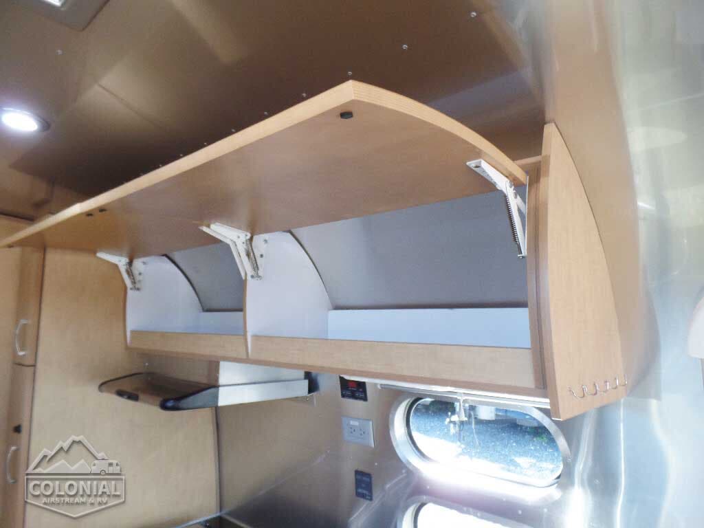 Pull Roller Shades on All Windows except Drapes on Panoramic Windows (N/A 30FB) • Bright Aluminum Finish Interior Skin • Wood drawer boxes w/ full extension, self closing ball-bearing drawer glides • Overhead Rooflockers w/ Radius Doors • Entrance Mat w/Airstream Logo • Grab Handle • Vinyl Flooring Throughout • Call Colonial Airstream 1-800-265-9019 • Satin Finish Hardware • 5-Hook Key Holder • LED Ceiling Lights • Magazine Rack (N/A 27′)• Laminate Furniture & Countertops.