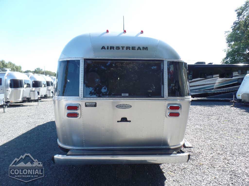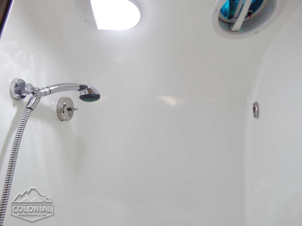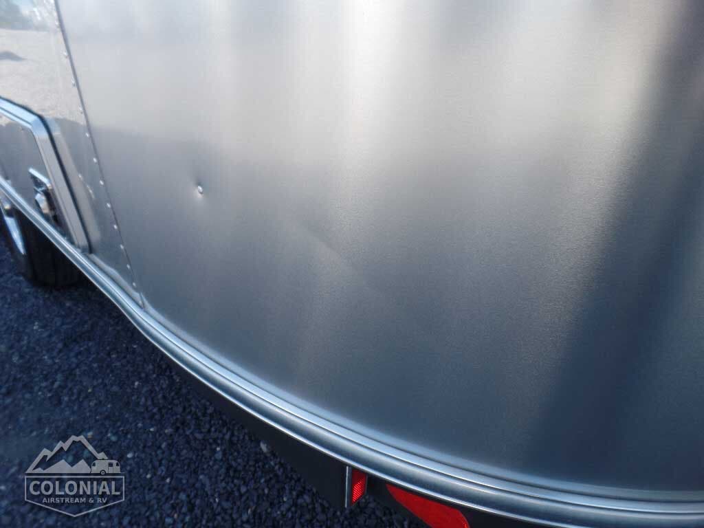Bright Aluminum Finish / White Aluminum Finish on Roof • Polished Rear Bumper w/Storage • Flying Cloud Medallions & Graphics w/Chrome Beltline & Rub-rail w Inserts • License Plate Bracket w/LED Light • Grab H&le-Cast Aluminum • Aluminum LP Bottle Cover • Enclosed & Insulated Underbelly & Tanks • Dark Grey Patio Awning C.S. • C.S. & R.S. Awning Rails • Solar Stoneguard • Stainless Steel Wrap Protectors • Main Door w/Opaque Window • Call Colonial Airstream 1-800-265-9019 • Diamond Plate Exterior Storage Compartment • Cast Taillights – 6” LED Oval • Exterior Shower • Exterior LP Service Port w/Quick Connect Hose & Adapter Fitting • Portal Windows • LED Light Strip on Patio Awning with Dimmer Switch.