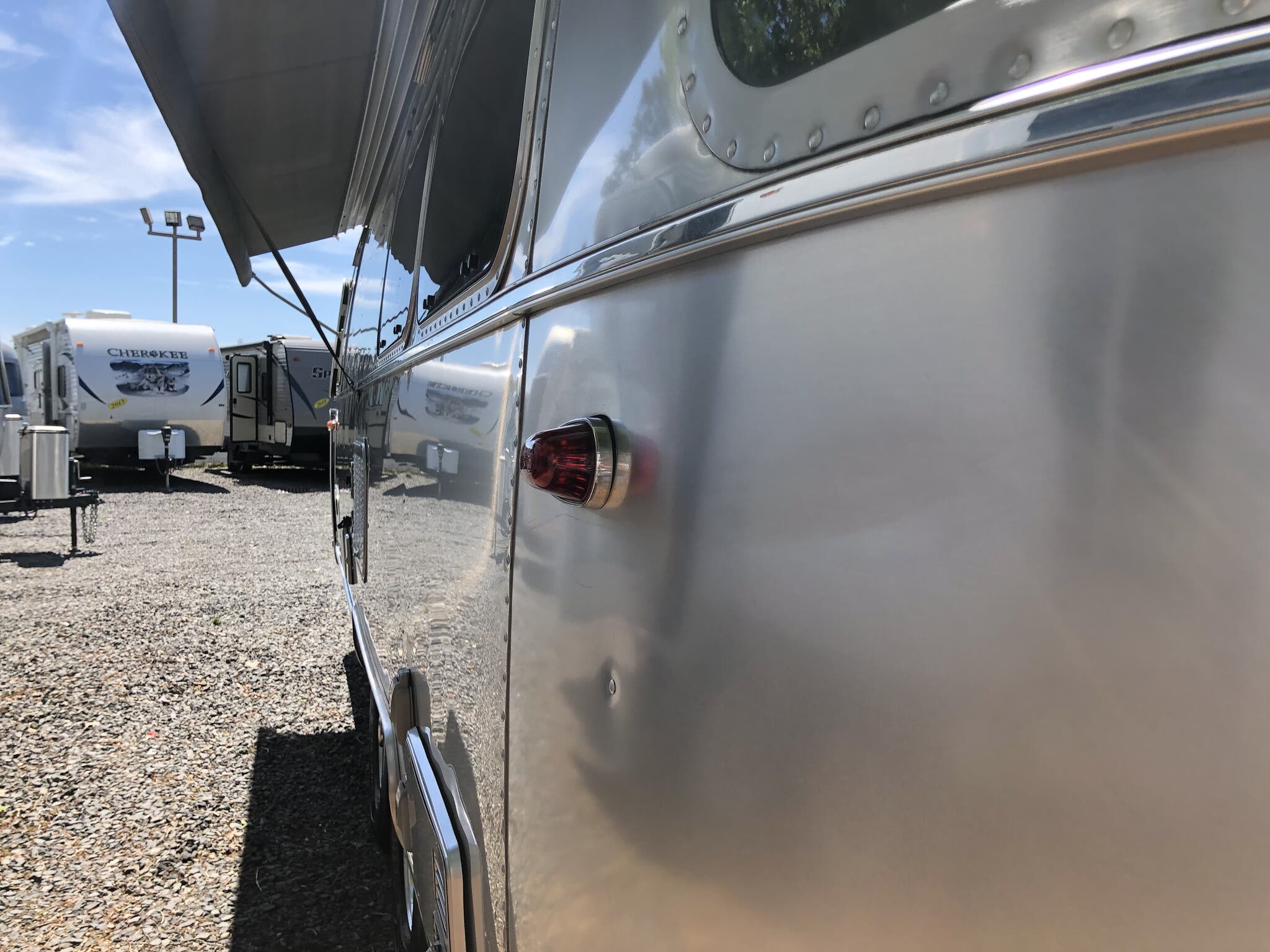 Pull Roller Shades on All Windows except Drapes on Panoramic Windows (N/A 30FB) • Bright Aluminum Finish Interior Skin • Wood drawer boxes w/ full extension, self closing ball-bearing drawer glides • Overhead Rooflockers w/ Radius Doors • Entrance Mat w/Airstream Logo • Grab Handle • Vinyl Flooring Throughout • Satin Finish Hardware • 5-Hook Key Holder • LED Ceiling Lights • Magazine Rack (N/A 27′)• Laminate Furniture & Countertops.