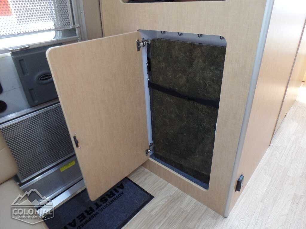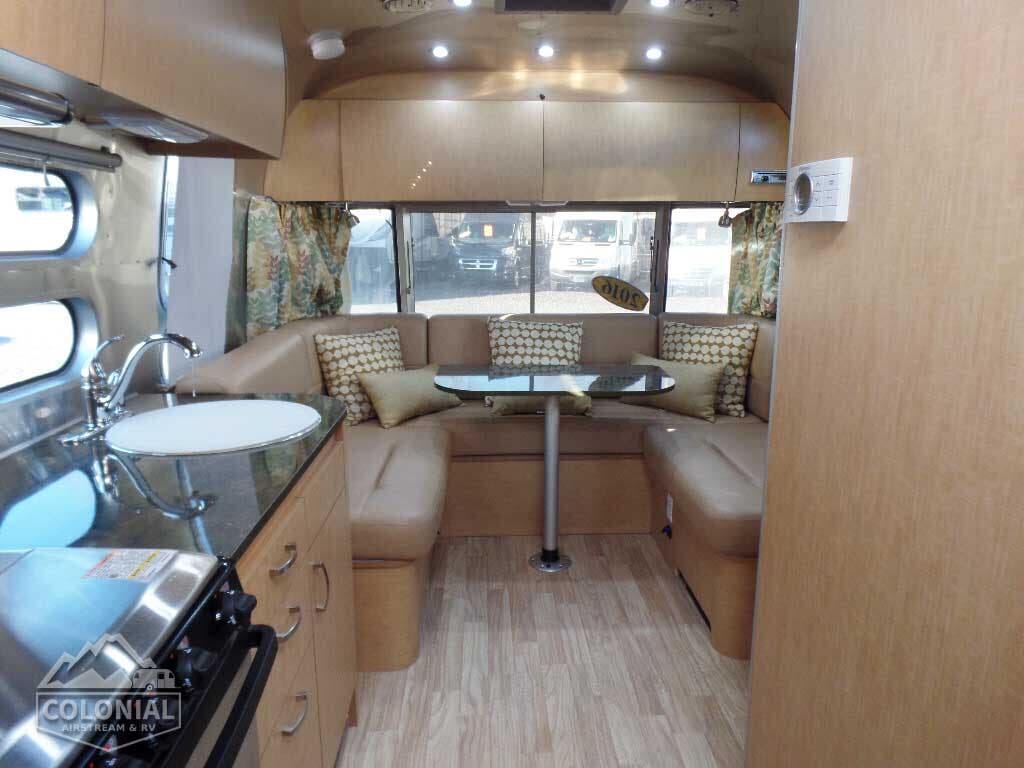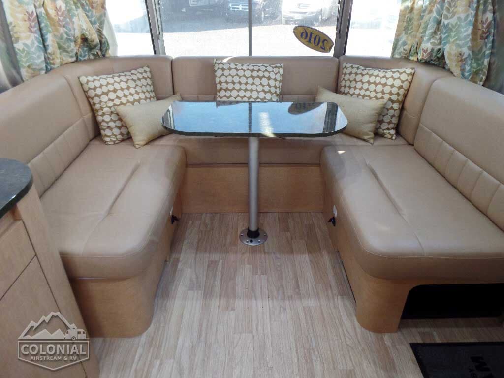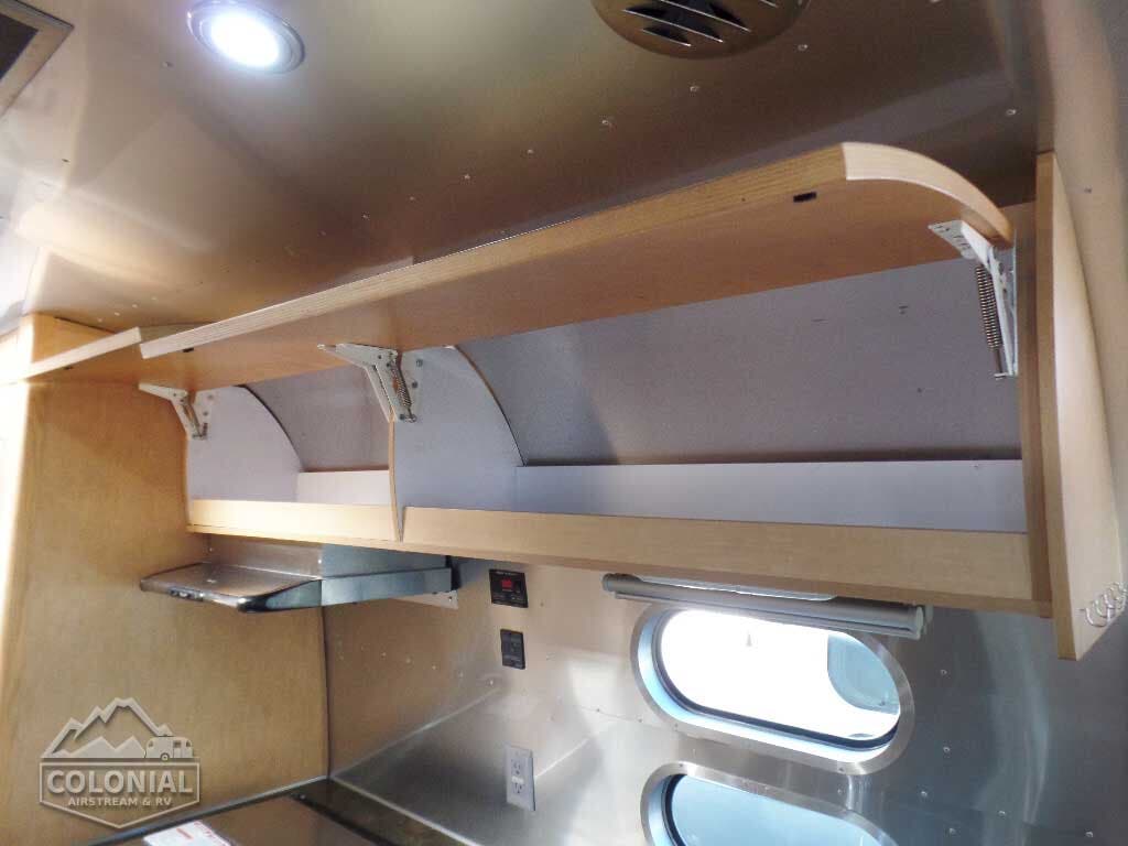 Pull Roller Shades on All Windows except Drapes on Panoramic Windows (N/A 30FB) • Bright Aluminum Finish Interior Skin • Wood drawer boxes w/ full extension, self closing ball-bearing drawer glides • Overhead Rooflockers w/ Radius Doors • Entrance Mat w/Airstream Logo • Grab Handle • Vinyl Flooring Throughout • Call Colonial Airstream 1-800-265-9019 • Satin Finish Hardware • 5-Hook Key Holder • LED Ceiling Lights • Magazine Rack (N/A 27′)• Laminate Furniture & Countertops.