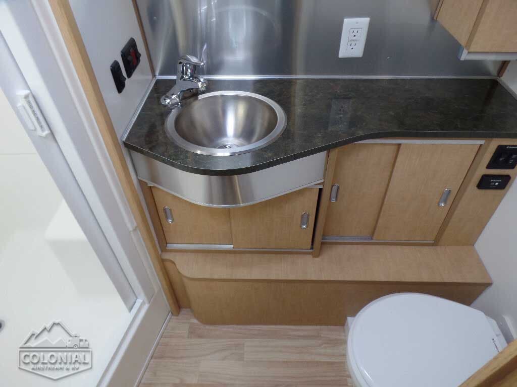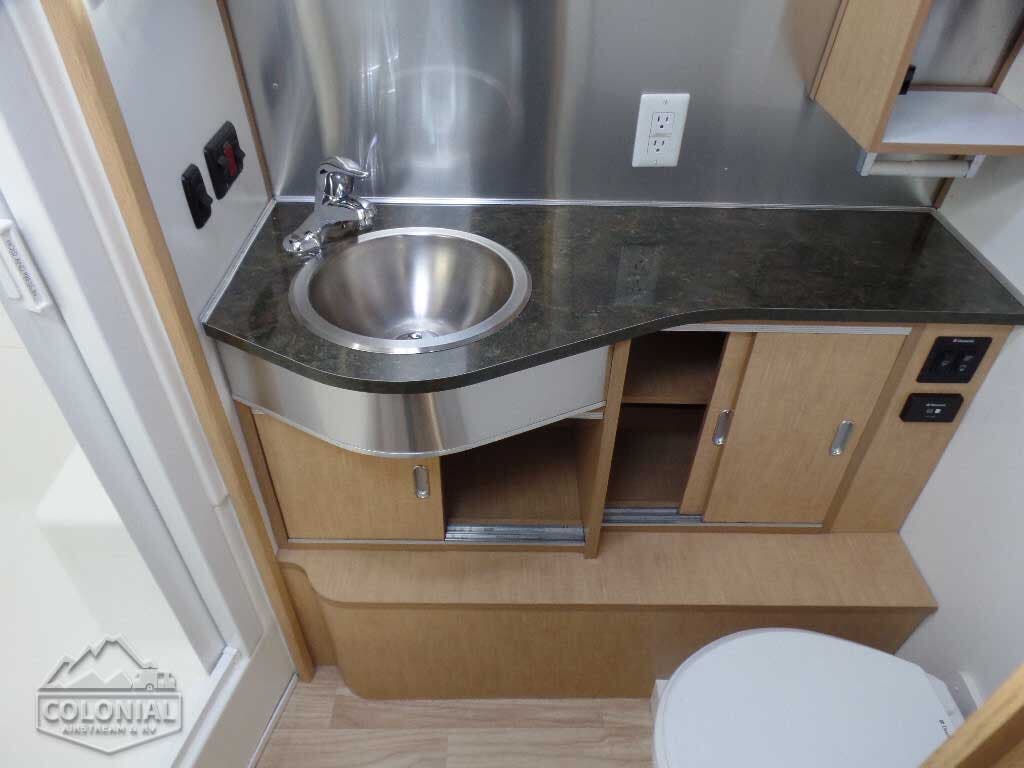 Bright Aluminum Finish / White Aluminum Finish on Roof • Polished Rear Bumper w/Storage • Flying Cloud Medallions & Graphics w/Chrome Beltline & Rub-rail w Inserts • License Plate Bracket w/LED Light • Grab H&le-Cast Aluminum • Aluminum LP Bottle Cover • Enclosed & Insulated Underbelly & Tanks • Dark Grey Patio Awning C.S. • C.S. & R.S. Awning Rails • Solar Stoneguard • Stainless Steel Wrap Protectors • Main Door w/Opaque Window • Call Colonial Airstream 1-800-265-9019 • Diamond Plate Exterior Storage Compartment • Cast Taillights – 6” LED Oval • Exterior Shower • Exterior LP Service Port w/Quick Connect Hose & Adapter Fitting • Portal Windows • LED Light Strip on Patio Awning with Dimmer Switch.