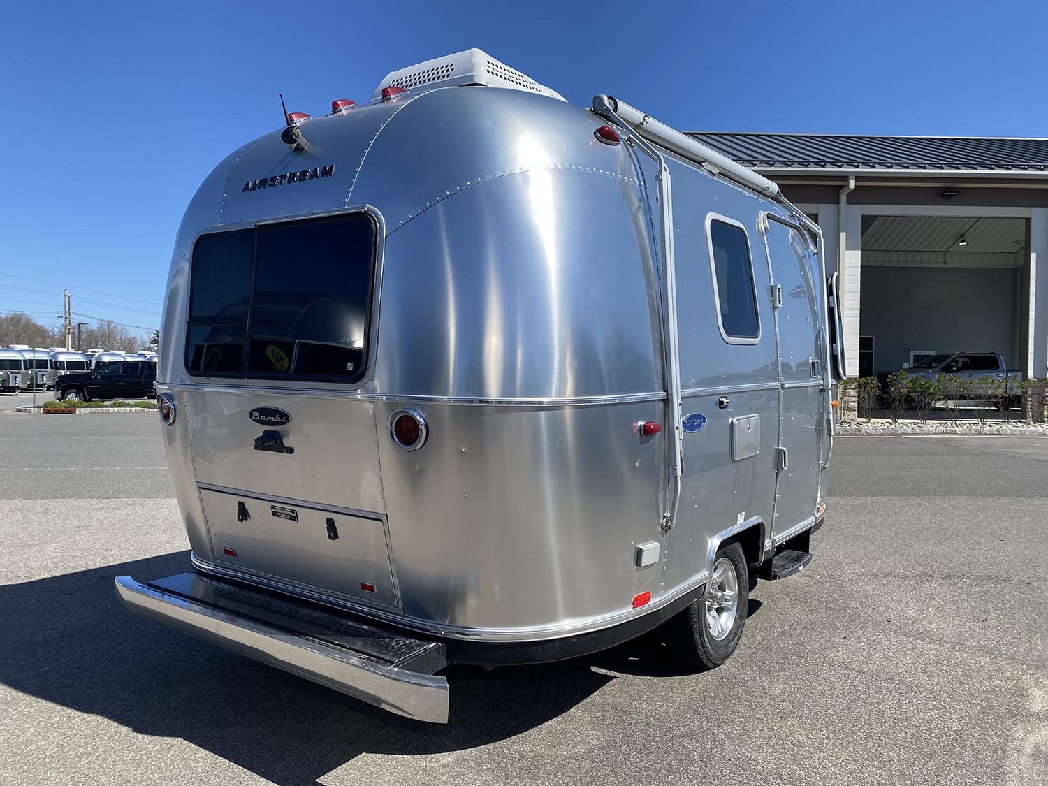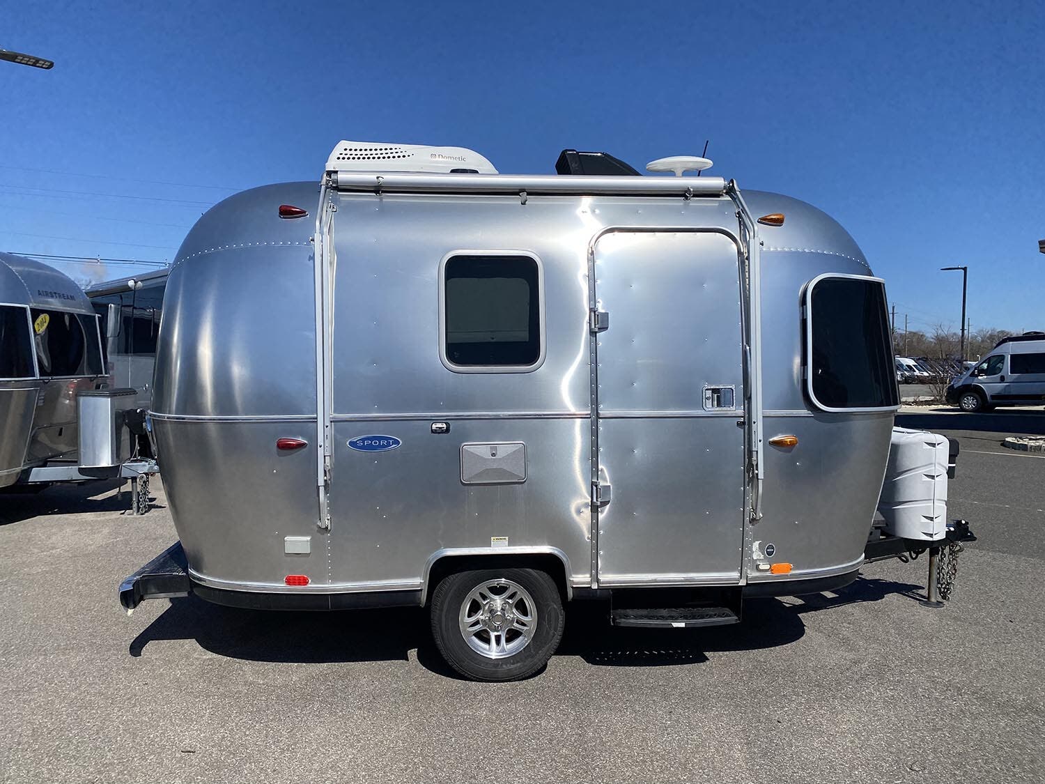 Bright Aluminum Finish – White Aluminum Finish on Roof • Sport Medallion • Bambi Medallion • Chrome Beltline & Rub-Rail Inserts • License Plate Bracket w/Light • Grab Handle – Cast Aluminum • Enclosed & Insulated Underbelly & Tanks • Colonial Airstream • C.S. & R.S. Awning Rails • Light Grey C.S. Patio Awning • Main Door • Solar Stone Guard • Coach Guard Wrap Protectors s • LP Bottle Cover • LED Taillights w/Chrome Bezel – 4” Round • Exterior Shower • Exterior LP Service Port w/Quick Connect Hose & Adapter Fitting.