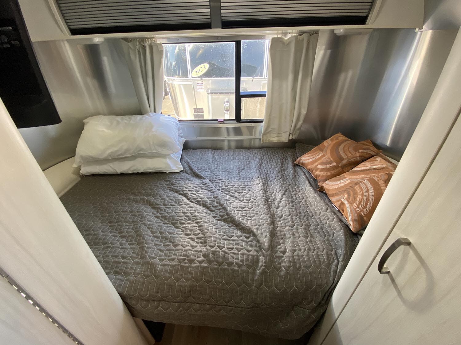Pillow Top Memory Foam Mattress • Quilted Bedspread w/Reverse Sham, Decorative Throw Pillows & 2 Regular Bed Pillows • Overhead Rooflocker at Bedroom w/Tambour Doors • Colonial Airstream • Removable Under Bed Storage Bins • Sleeping Capacity: 2 – 3 (16’); 2 – 4 (22’).
