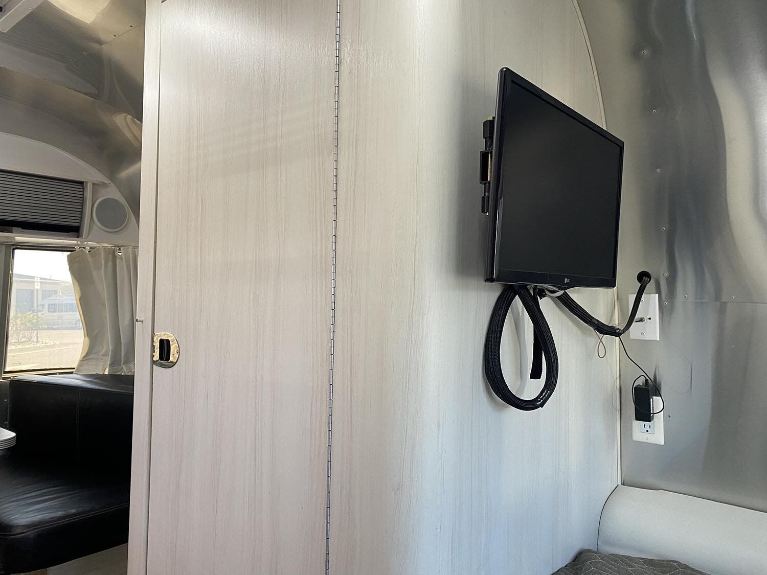 Brushed Aluminum Mini Blinds • Full Close-Out Drapes at Panoramic & Bedroom Windows • Laminate Furniture & Countertops • Bright Aluminum Finish Interior Skin • Seamless Vinyl Flooring Throughout • Colonial Airstream • Overhead Rooflockers w/Tambour Doors • Interior Grab H&le • Entrance Mat w/ Airstream Logo • Coat Hooks • Information Board • LED Lighting.