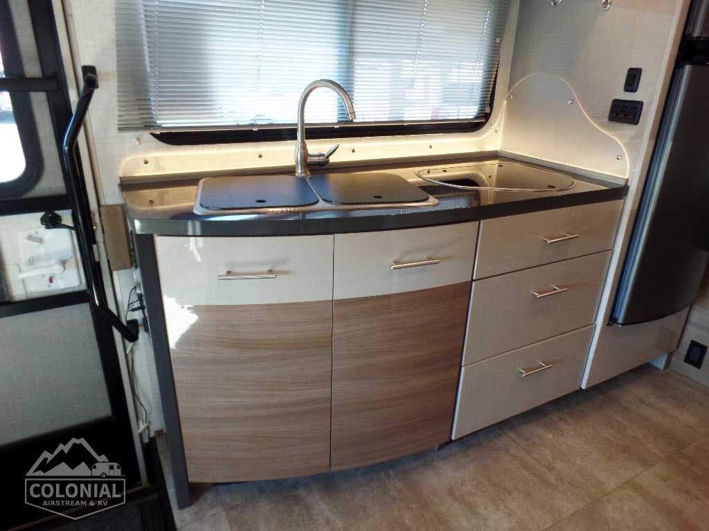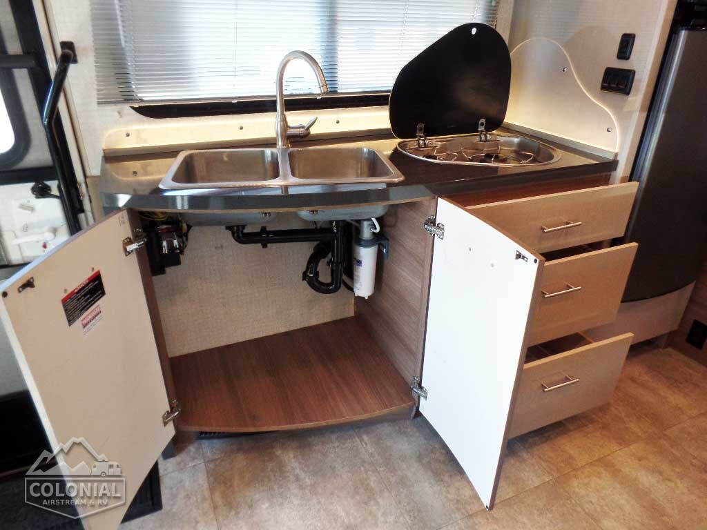 Laminate countertops • Microwave/convection oven • 2-burner range top w/glass cover • Norcold® two-door refrigerator/freezer • Cold water filtration system
