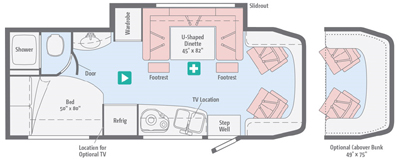 Infotainment Center with Rand McNally RV GPS 6″ touch screen color monitor w/split screen function, Rand McNally RV GPS safe & easy routing, amenities & tools, trips & content, turn-by-turn voice guidance, AM/FM radio w/CD/DVD player, handheld remote, SiriusXM™ (subscription not included), compass, outside temperature, iPod/iPhone® audio integration, Bluetooth™, color rearview camera