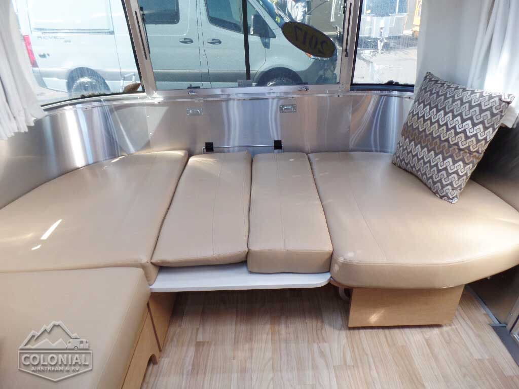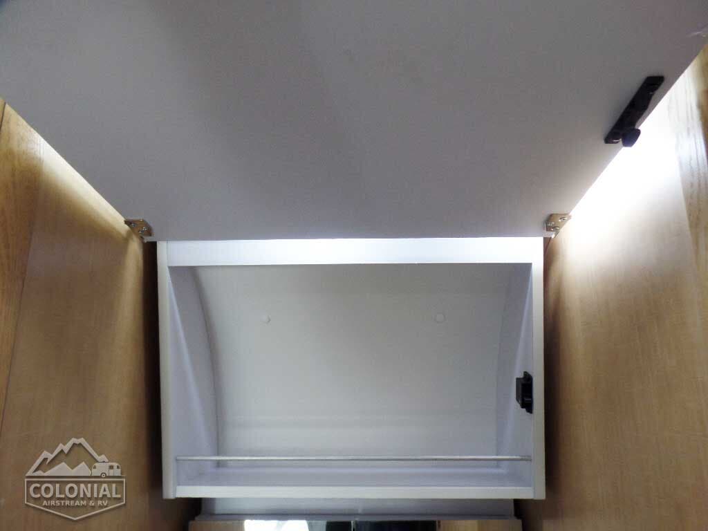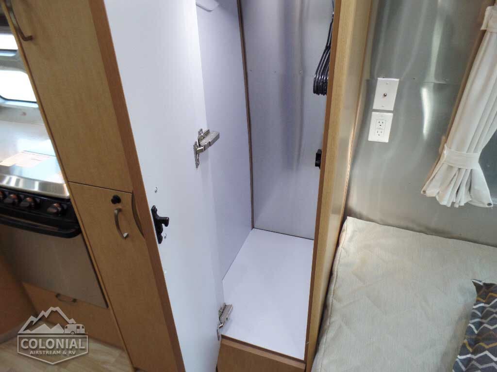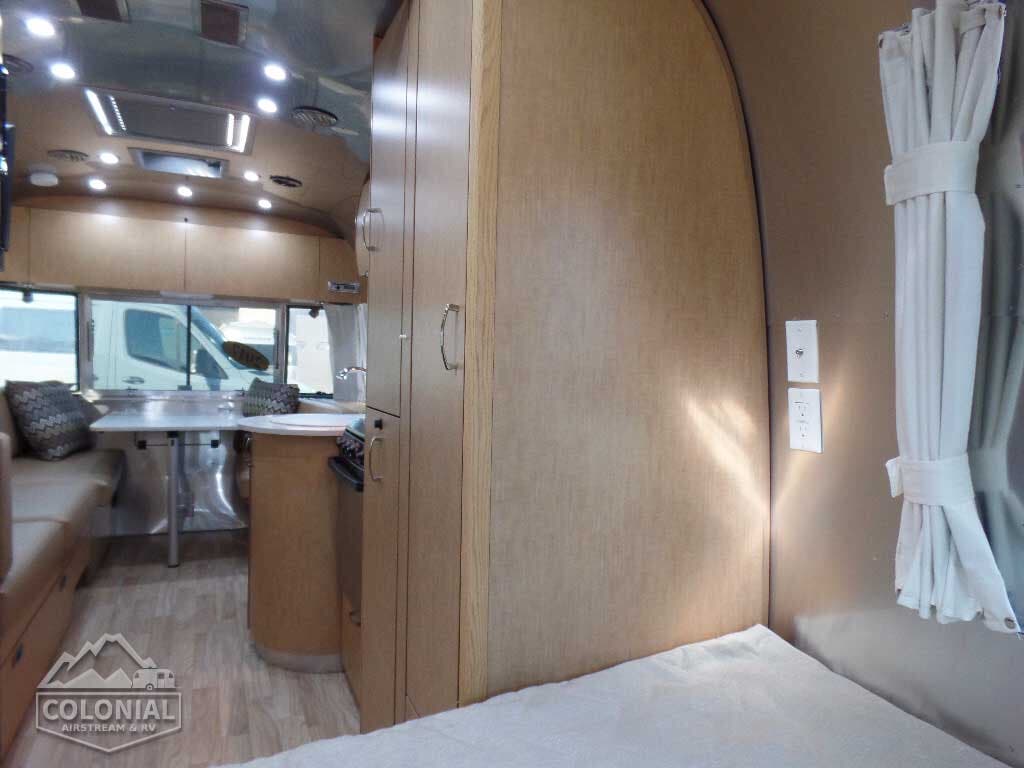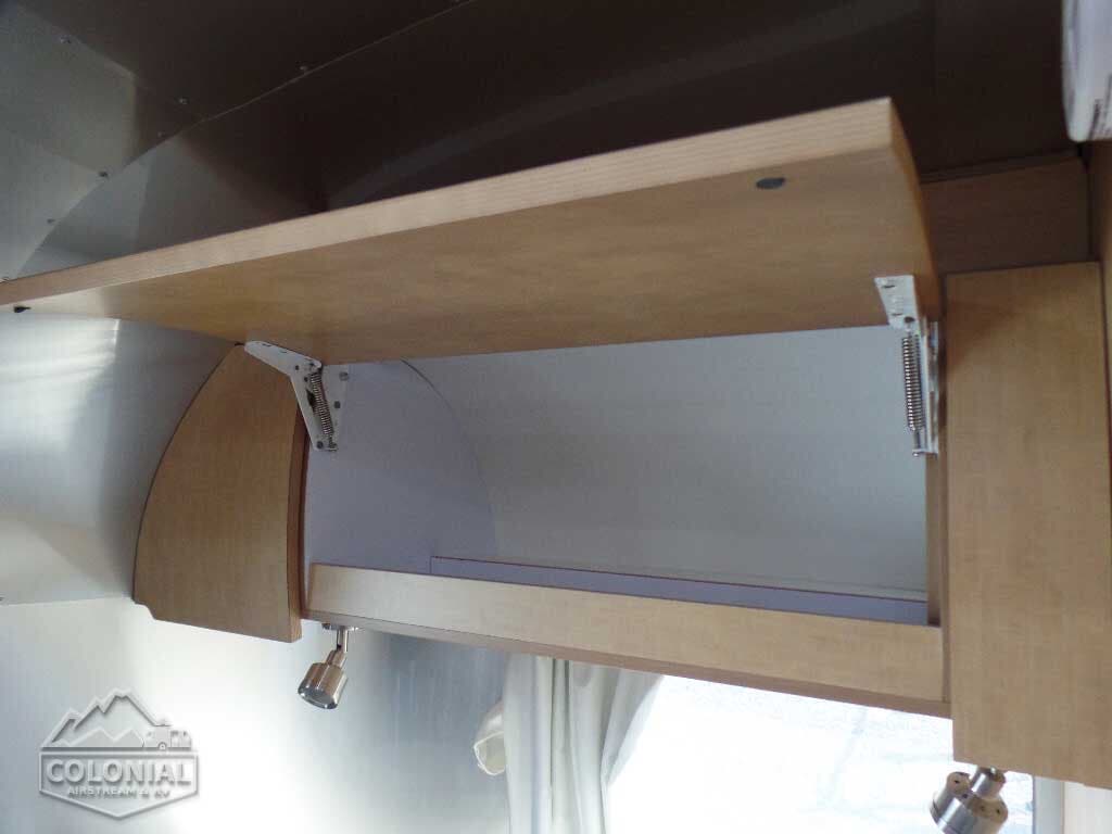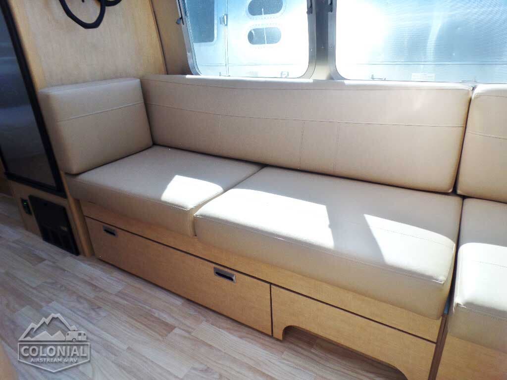 Pull Roller Shades on All Windows except Drapes on Panoramic Windows (N/A 30FB) • Bright Aluminum Finish Interior Skin • Wood drawer boxes w/ full extension, self closing ball-bearing drawer glides • Overhead Rooflockers w/ Radius Doors • Entrance Mat w/Airstream Logo • Grab Handle • Vinyl Flooring Throughout • Call Colonial Airstream 1-800-265-9019 • Satin Finish Hardware • 5-Hook Key Holder • LED Ceiling Lights • Magazine Rack (N/A 27′)• Laminate Furniture & Countertops.