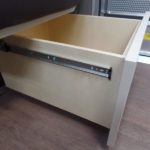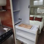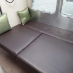 Corian Galley Top • Sink Cover • S.S. Single Round Bowl 18” Sink (Rectangular Bowl 15.75" on 19′) • Chrome Faucet w/Pull-Out • Filtered Cold Water • Brushed Stainless Steel Insert on Refrigerator • Bi-Fold Stainless Steel Range Cover • Overhead Rooflocker w/Slider Doors & LED Accent Lighting 42" X 76" Dinette (23’D, 25′ & 27′) • 39" X 76" Dinette ( 23’FB, 28′ & 30′) 40" X 74" Dinette ( 19′) • Call Colonial Airstream 1-800-265-9019 • Cutlery Drawer w/Hardwood Maple Drawer Organizer.