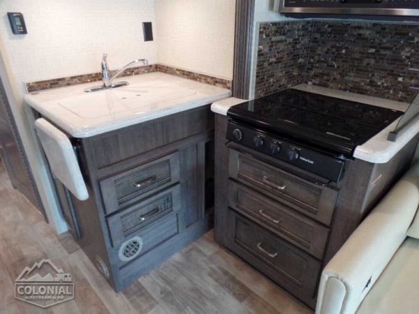 Corian® countertops • Flip-up Corian countertop extension (30J) • 2-door refrigerator/freezer • 3-burner range top w/storage below • Microwave oven w/vented range fan