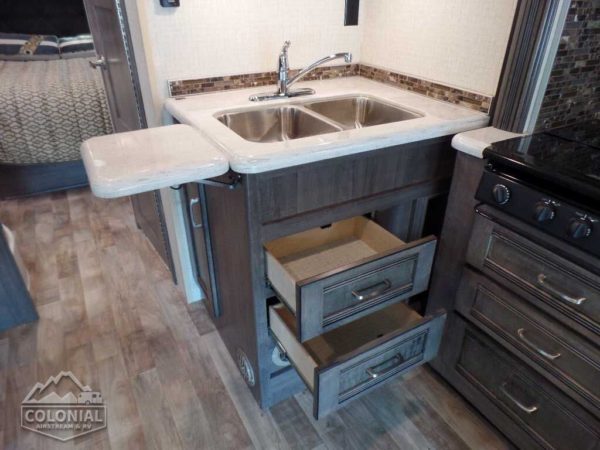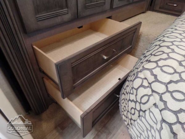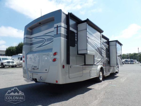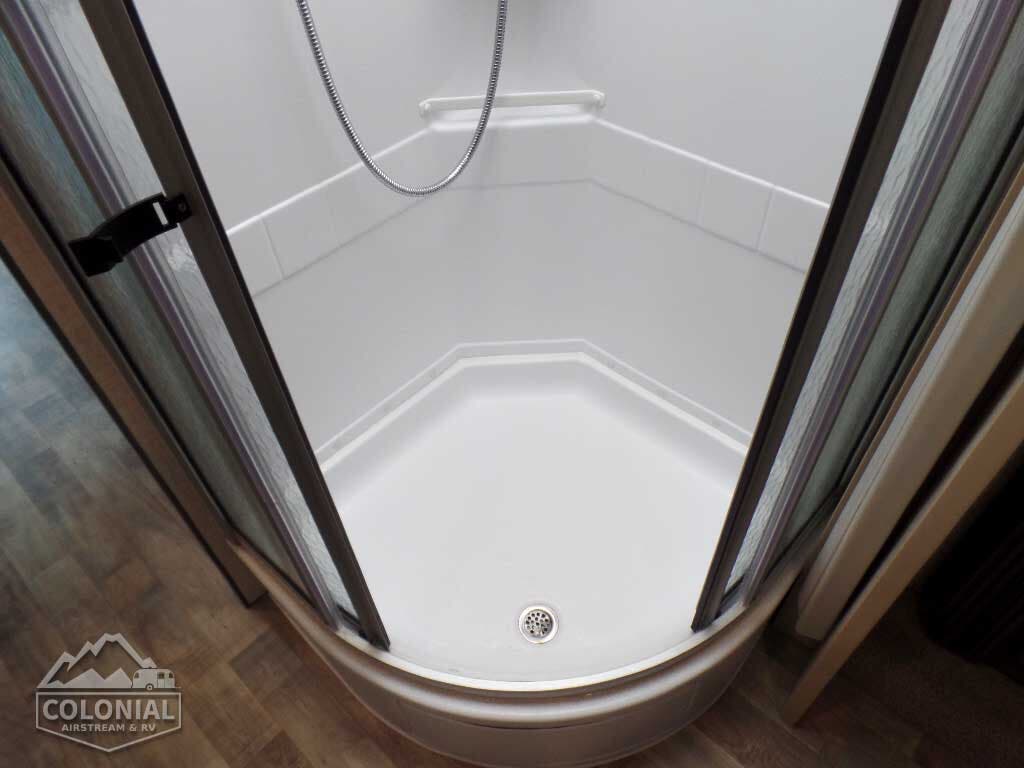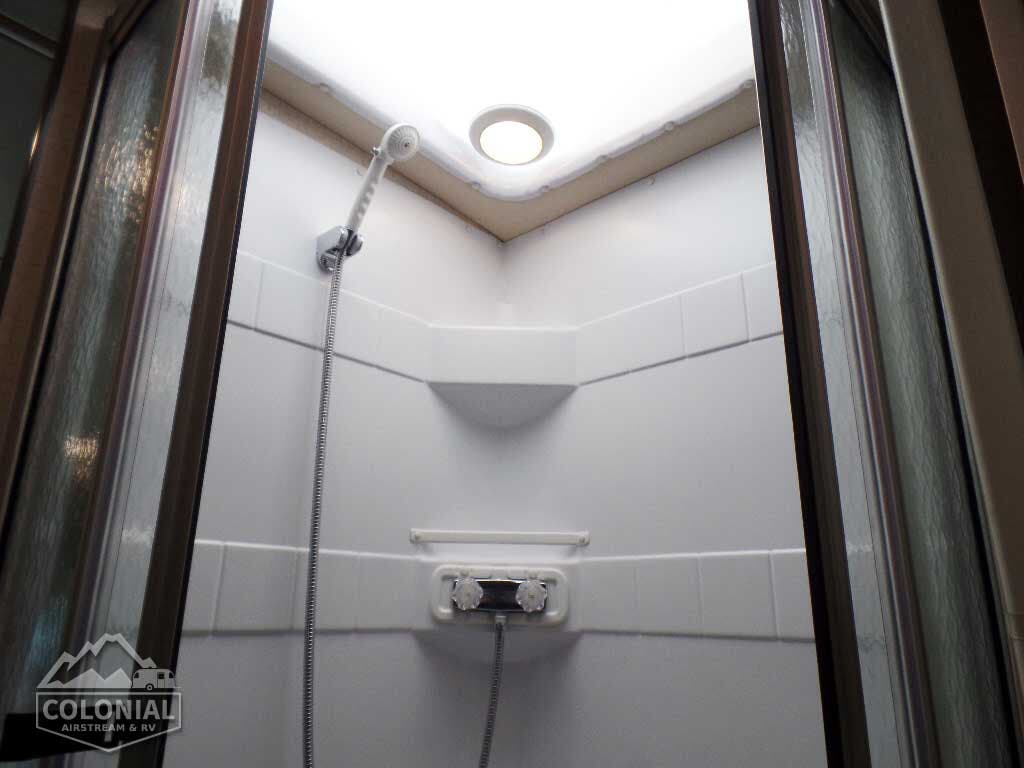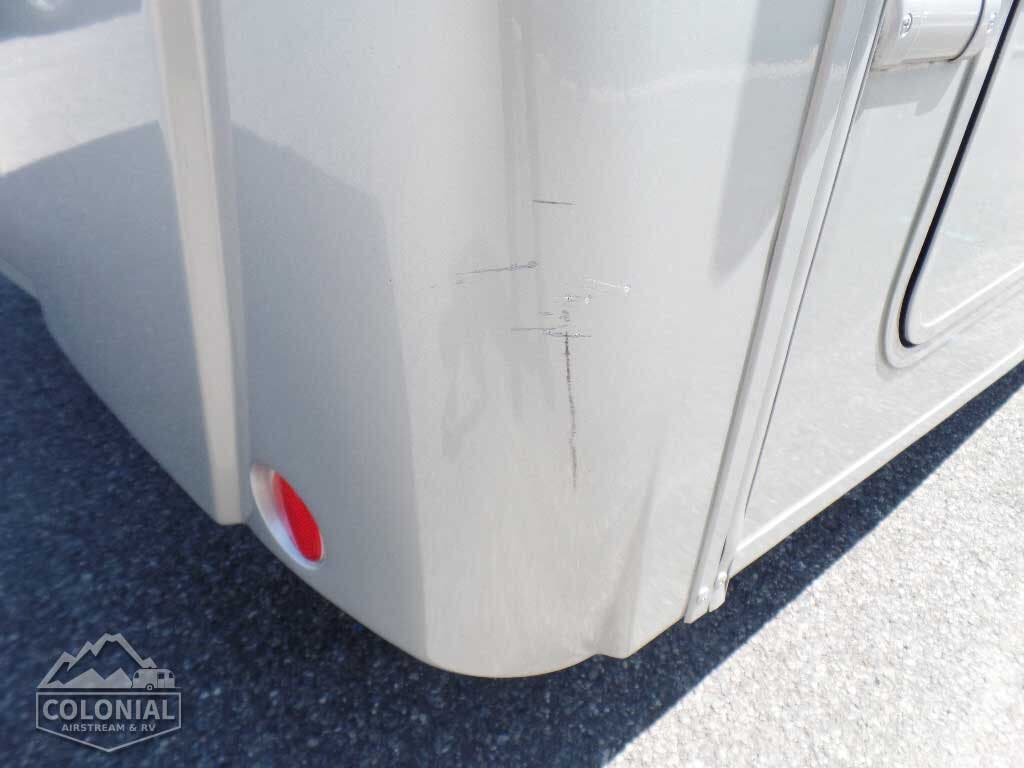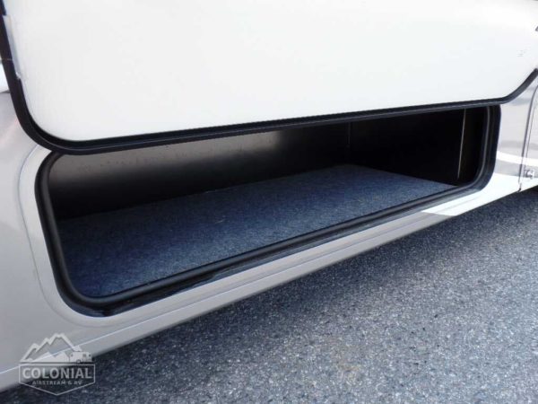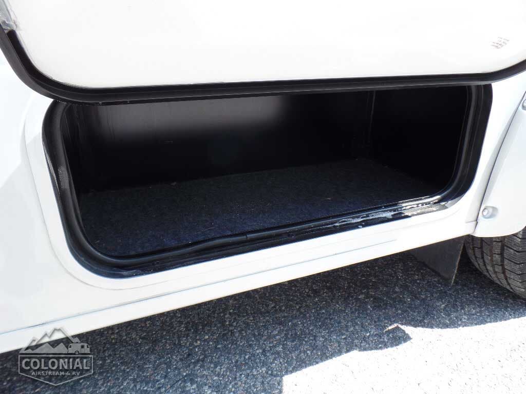 Powered patio awning w/metal wrap w/LED lighting • Porch light • Stepwell light • Premium high-gloss skin • Rear mud flaps • Large rear storage compartment w/rotocast compartments w/drain plugs, cover/30″ x 72″ folding table (27K, 30J) • Fiberglass running boards w/wheel lips