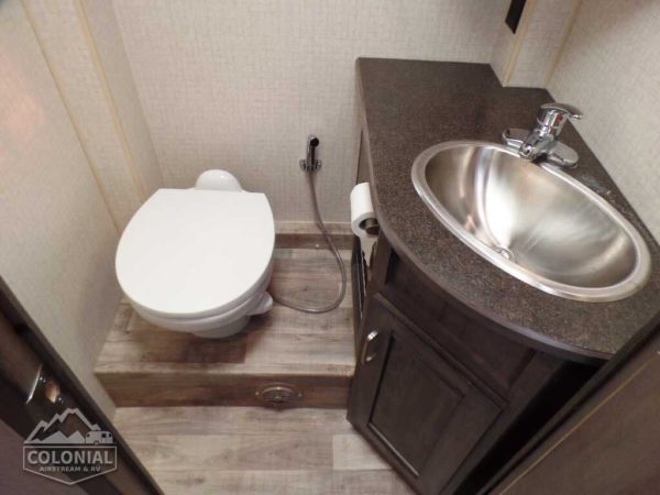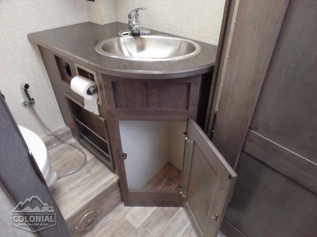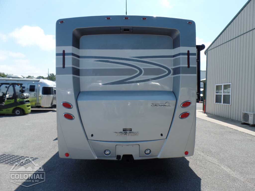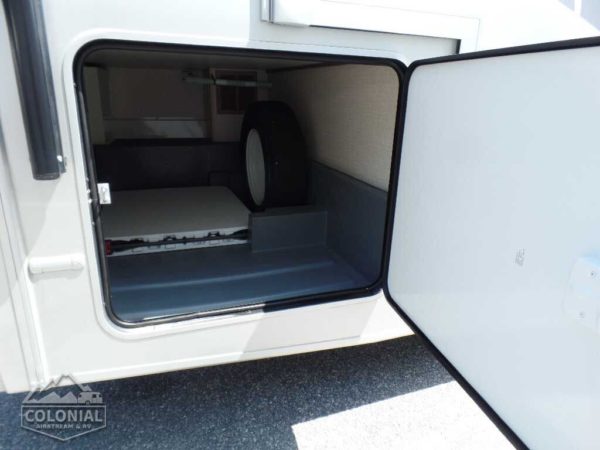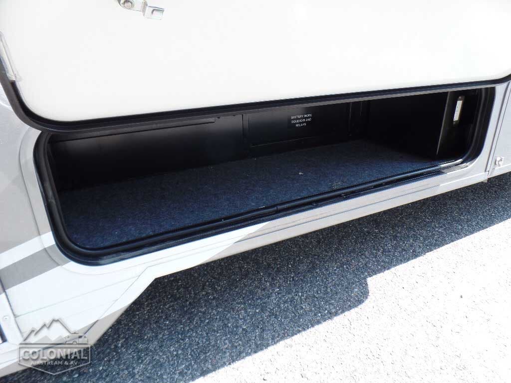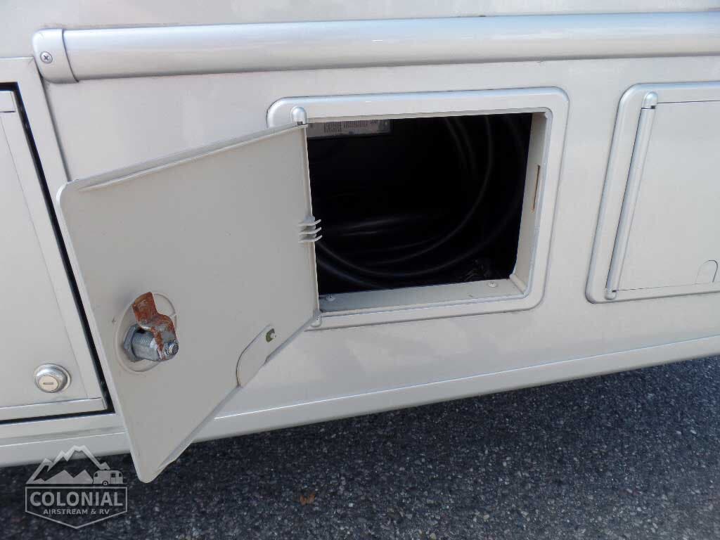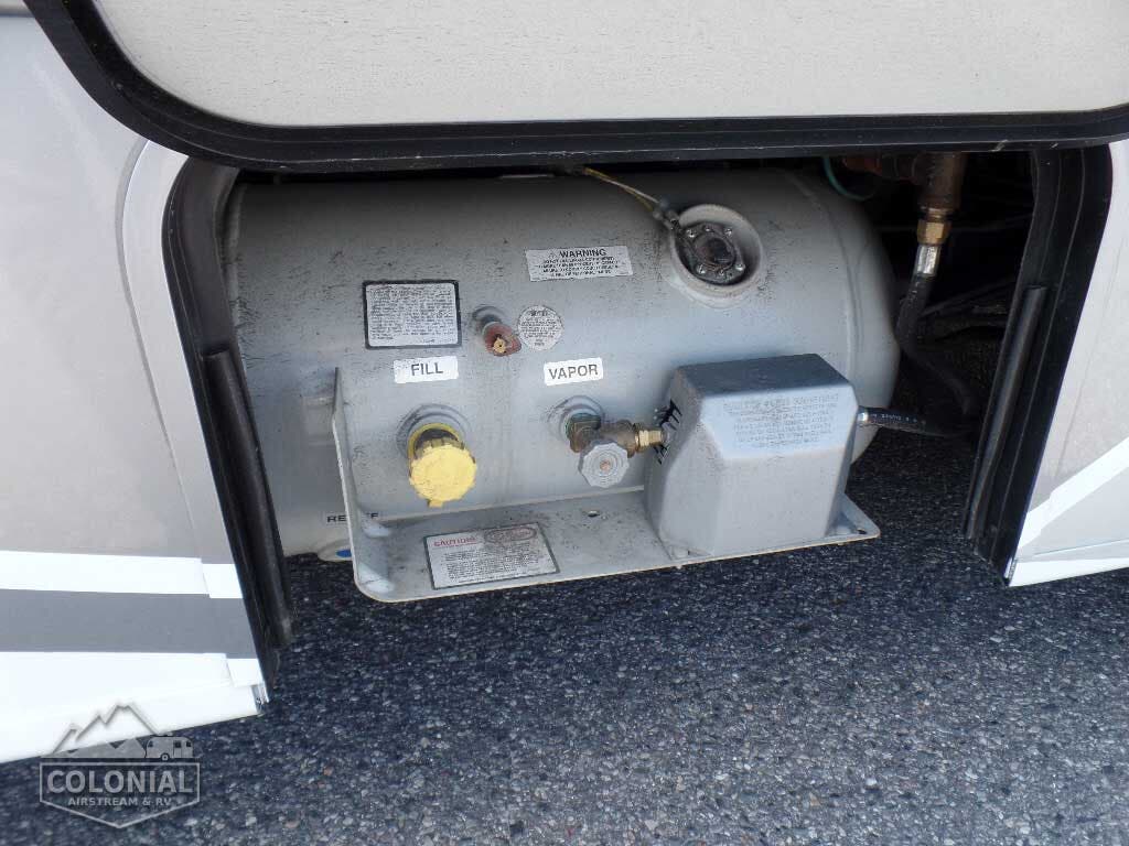 Rear Trunk w/Service Center cable TV input, portable satellite dish hookup, pressurized city water hookup w/diverter valve, exterior wash station w/lighted pump switch • Drainage valve compartment • Water tank fill w/lockable door • 10′ sewer hose • 6-gallon electric ignition, 110-volt/LP water heater w/Energy Management System (EMS) • Winterization Package water heater bypass valve and siphon tube • Permanent-mount LP tank w/gauge • Heated holding tank compartment • On-demand water pump • TrueLevel™ holding tank monitoring system