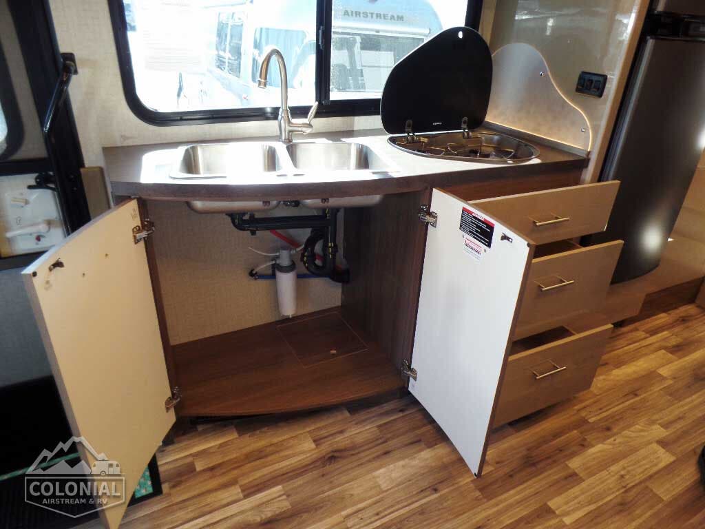 Laminate countertops • Microwave/convection oven w/touch control • 2-burner range top w/glass cover • Norcold® double-door refrigerator/freezer • Cold water filtration system • Water-pump switch w/light
