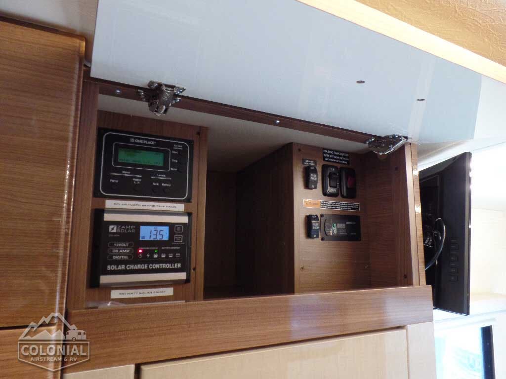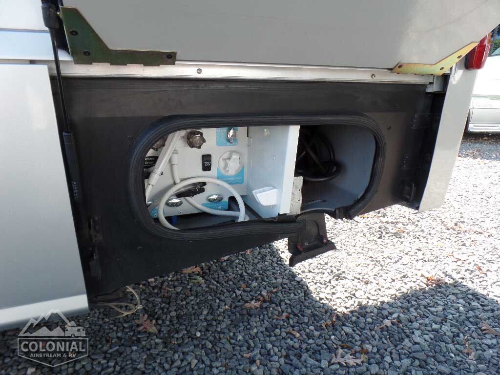 Service Center color-coded labels, pressurized city water hookup/tank diverter valve, drainage valves, exterior wash station w/lighted pump switch • 10′ sewer hose • TrueLevel™ holding tank monitoring system • 6-gallon 110-volt/LP water heater w/Energy Management System (NA 24G) • Tankless water heater (24G) • Permanent-mount LP Tank w/remote fill w/power switches • Winterization Package water heater bypass valve and siphon tube • On-demand water pump • Lockable water tank fill • Sewage pump macerator (24G, 24V) • Holding tank flushing system