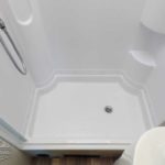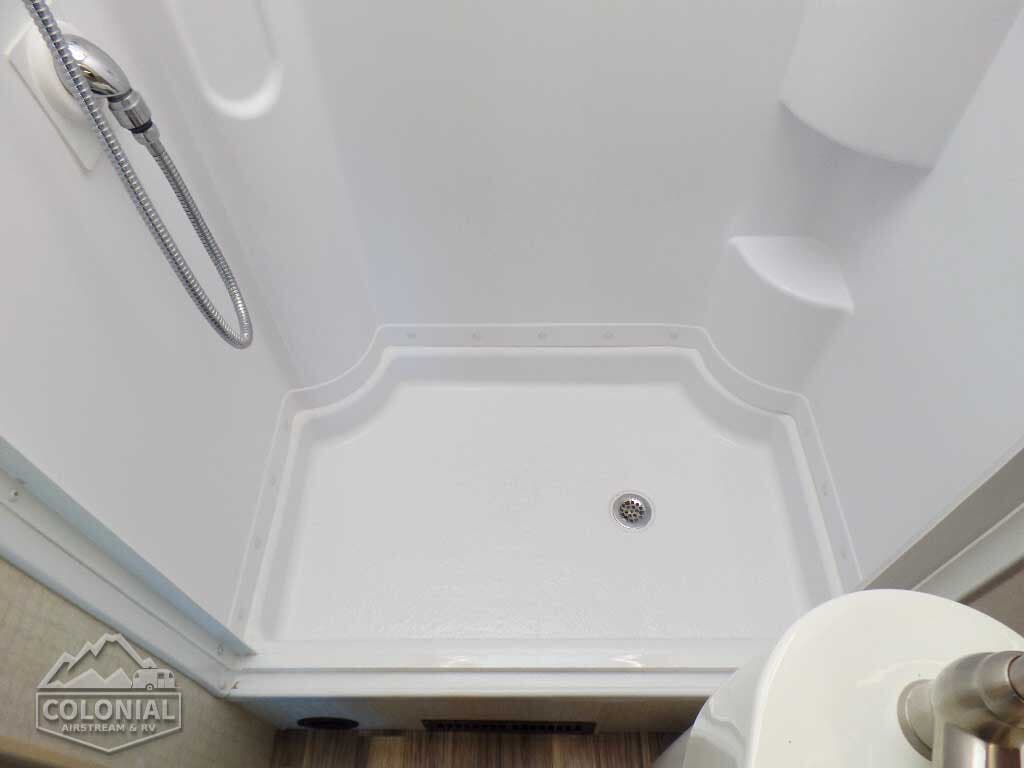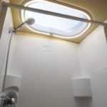Retractable, self-cleaning shower screen • Flexible showerhead • Skylight • Porcelain toilet w/foot pedal and sprayer (24J, 24V) • Porcelain toilet w/electric flush (24G) • Powered roof vent • Towel ring(s) • Towel bar(s) • Tissue holder • Robe hook(s) (24J) • Medicine cabinet (24G)