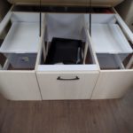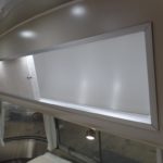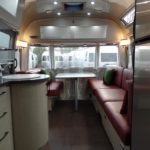 GALLEY DECOR Corian Galley Top • Sink Cover • S.S. Single Round Bowl 18” Chrome Faucet w/Pull-Out • Filtered Cold Water • Brushed Stainless Steel Insert on Refrigerator • Bi-Fold Stainless Steel Range Cover • Overhead Rooflocker w/Slider Doors & LED Accent Lighting 42″ X 76″ Dinette (23CB, 25’FB, 25RB & 27FB) • 39″ X 76″ Dinette ( 23FB, 28RB & 30RB) • Call Colonial Airstream 1-800-265-9019 • Cutlery Drawer w/Hardwood Maple Drawer Organizer.
