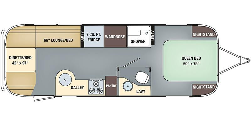 INTERIOR DECOR Pull Roller Shades on All Windows Ecxept Drapes on Panoramic Windows • Full Close Out Drapes At Panoramic Windows W/Blackout Linings • Bright Aluminum Finish Interior Skin • Laminate Furniture & Countertops • Wood drawer boxes w/ full extension, self closing ball-bearing drawer glides • Call Colonial Airstream 1-800-265-9019 • Overhead Rooflockers w/ Slider Doors & LED Accent Lighting • Entrance Mat w/Airstream Logo • Interior Grab Handle • Vinyl Flooring Throughout • Magazine Rack (N/A 27FB)