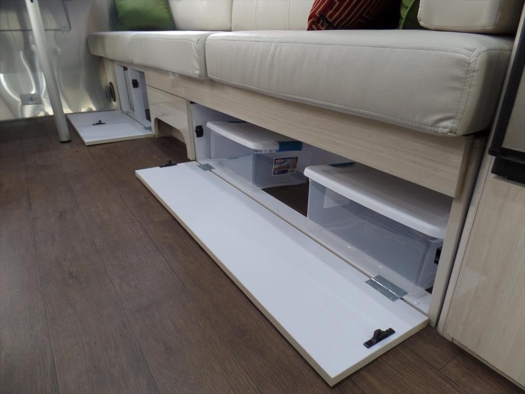 GALLEY DECOR Corian Galley Top • Sink Cover • S.S. Single Round Bowl 18” Chrome Faucet w/Pull-Out • Filtered Cold Water • Brushed Stainless Steel Insert on Refrigerator • Bi-Fold Stainless Steel Range Cover • Overhead Rooflocker w/Slider Doors & LED Accent Lighting 42″ X 76″ Dinette (23CB, 25’FB, 25RB & 27FB) • 39″ X 76″ Dinette ( 23FB, 28RB & 30RB) • Call Colonial Airstream 1-800-265-9019 • Cutlery Drawer w/Hardwood Maple Drawer Organizer.