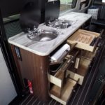 Corian© Countertop w/Backsplash • Sink w/Integrated Cover & Fold Down Faucet • Cutlery Drawer • Welt Trim Around Window Opening On Valances.