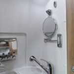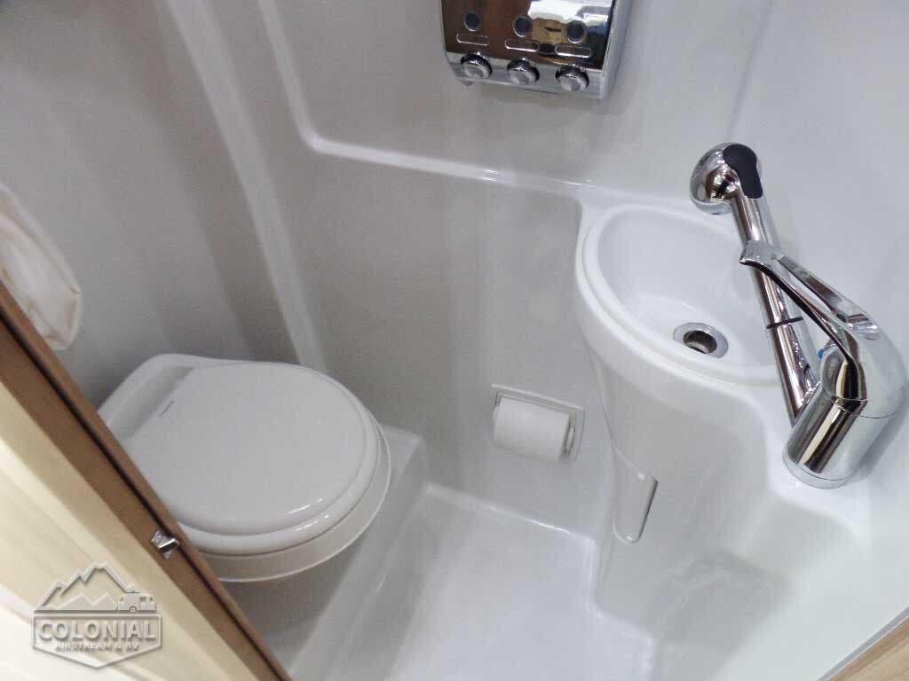 Wet Bath with Shower Curtain • Call Colonial RV For the Best Price 800 265-9019 • Toilet Residential Style, Larger Size, 360 Triple Jet Flow Rise • LED Shower Lights (2) • Toilet Paper Holder • Towel Bar • Lavatory • Retractable Clothes Line • Mirror • Bath Exhaust Fan.