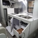 GALLEY DECOR Laminated Galley Top • Aluminum Inserts on Refrigerator • Galley Overhead Rooflocker w/Tambour Doors • Full Height Road Side Storage Cabinet • Fixed Dinette 40” X 74” (16RB); U-Dinette 74.5″ X 38” (22FB) • Colonial Airstream • Stainless Steel Sink w/Cover • Decorative Throw Pillows • Cutlery Drawer w/Hardwood Maple Drawer Organizer • Stainless Steel Galley Sink (Double on 22FB) With Seperate Faucet and Cover • Front Panoramic Black Out Curtains.