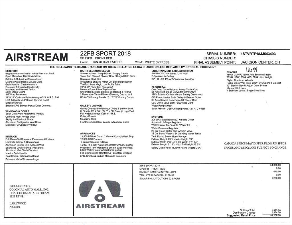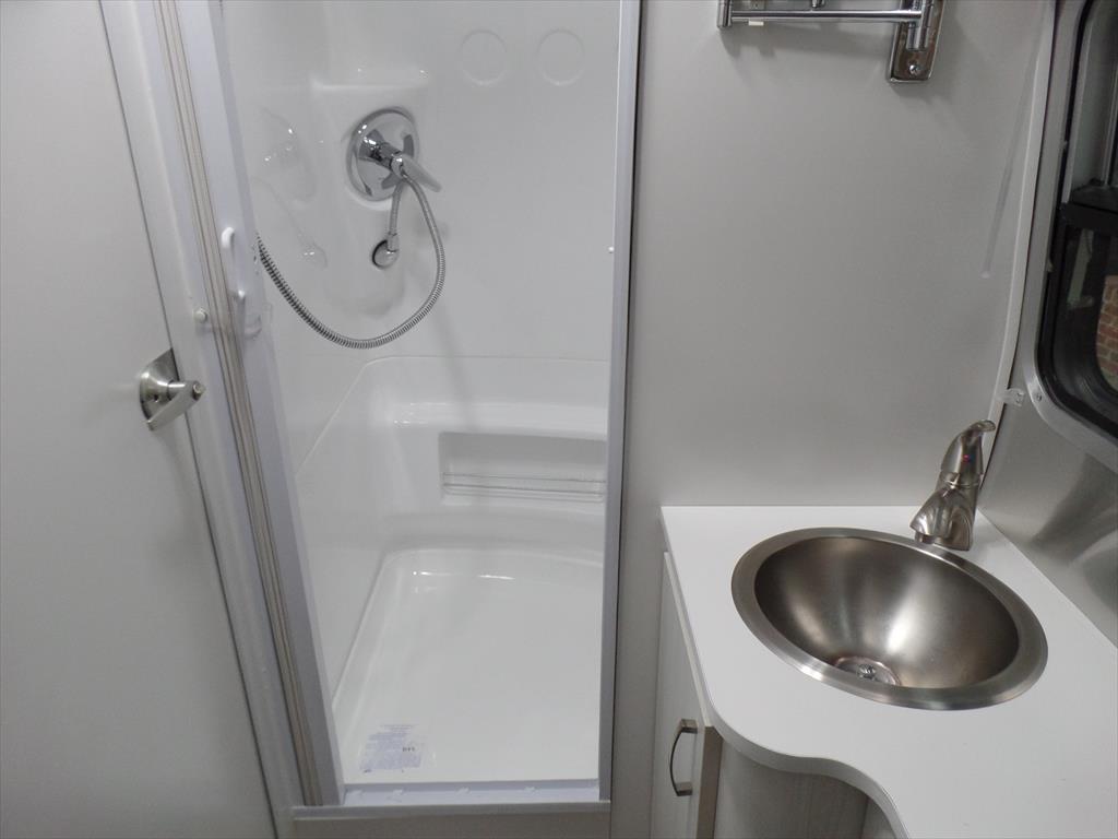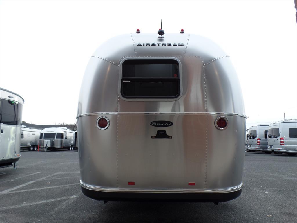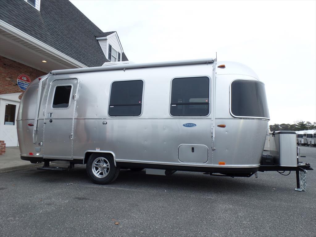 EXTERIOR Bright Aluminum Finish – White Aluminum Finish on Roof • Sport Medallion • Bambi Medallion • Chrome Beltline & Rub-Rail Inserts • License Plate Bracket w/Light • Grab Handle – Cast Aluminum • Enclosed & Insulated Underbelly & Tanks • Colonial Airstream • C.S. & R.S. Awning Rails • Light Grey C.S. Patio Awning • Main Door • 3 pc. Solar Stone Guard • Coach Guard Wrap Protectors • Aluminum LP Bottle Cover • LED Taillights w/Chrome Bezel – 4” Round • Exterior Shower • Exterior LP Service Port w/Quick Connect Hose & Adapter Fitting • Roof mounted “plug & play” solar pre-wire • Portable Solar Plug- Mounted on A-frame.