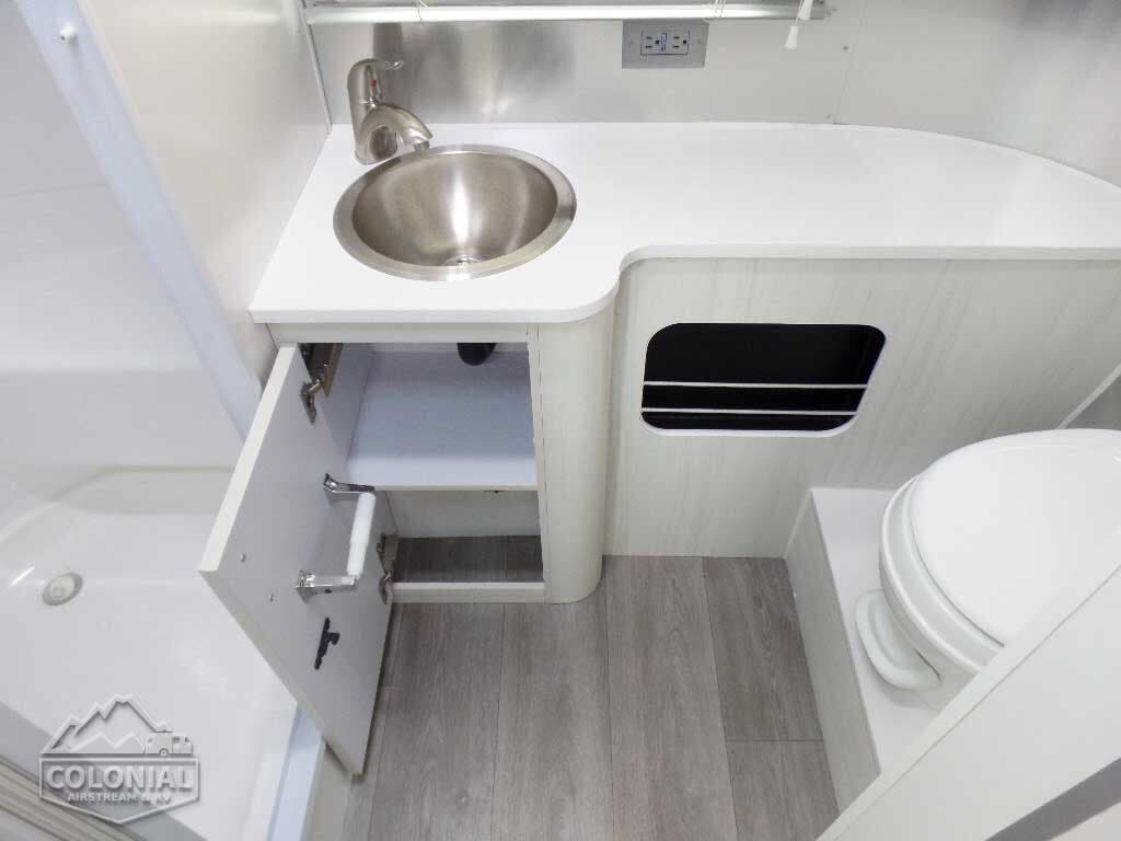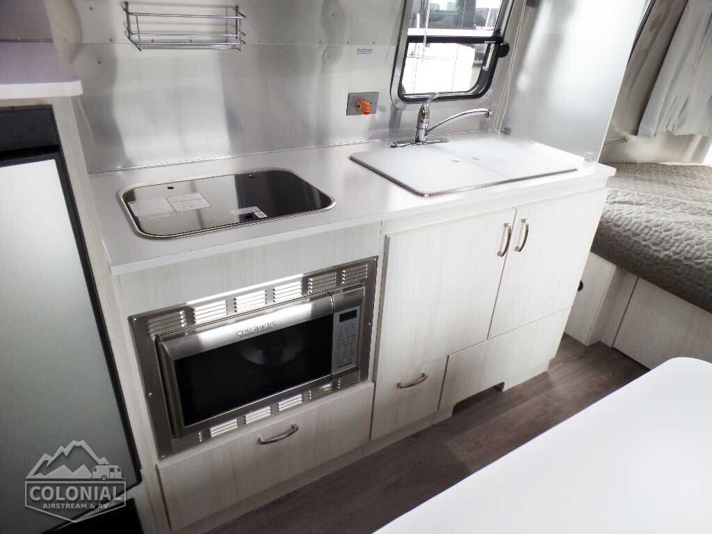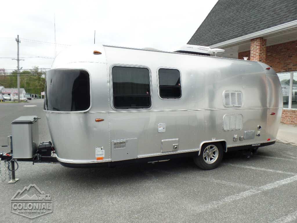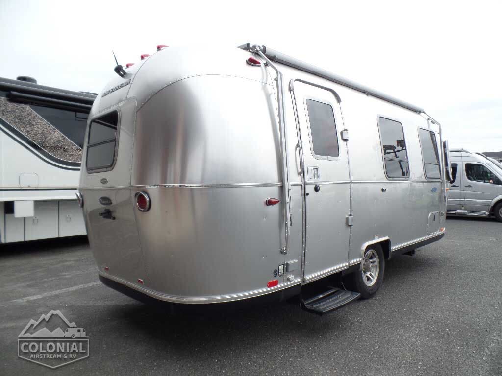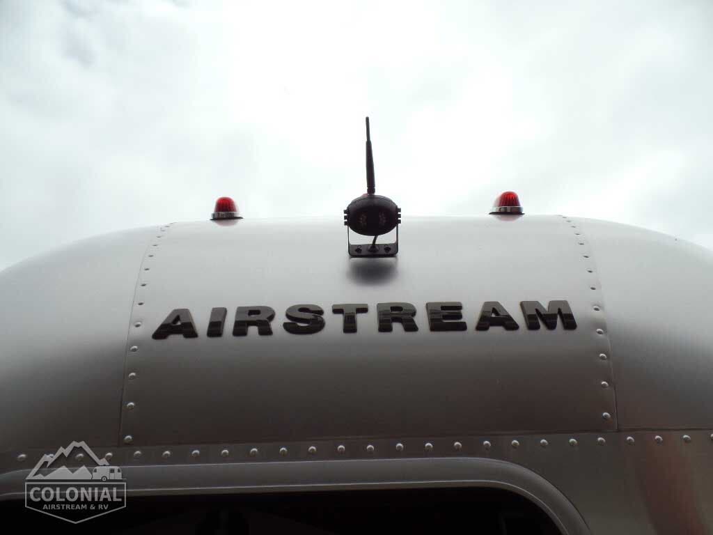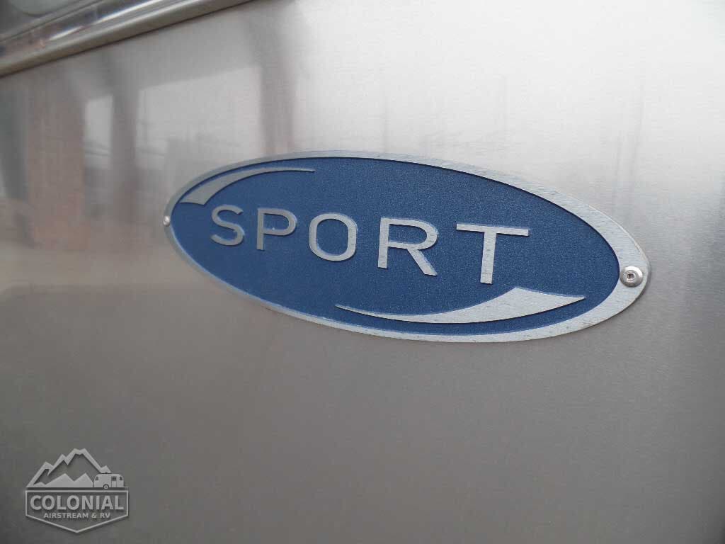 EXTERIOR Bright Aluminum Finish – White Aluminum Finish on Roof • Sport Medallion • Bambi Medallion • Chrome Beltline & Rub-Rail Inserts • License Plate Bracket w/Light • Grab Handle – Cast Aluminum • Enclosed & Insulated Underbelly & Tanks • Colonial Airstream • C.S. & R.S. Awning Rails • Light Grey C.S. Patio Awning • Main Door • 3 pc. Solar Stone Guard • Coach Guard Wrap Protectors • Aluminum LP Bottle Cover • LED Taillights w/Chrome Bezel – 4” Round • Exterior Shower • Exterior LP Service Port w/Quick Connect Hose & Adapter Fitting • Roof mounted “plug & play” solar pre-wire • Portable Solar Plug- Mounted on A-frame.