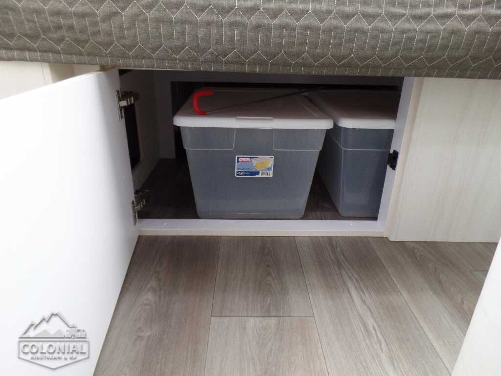 BEDROOM DECOR Pillow Top Memory Foam Mattress • Quilted Bedspread w/Reverse Sham, Decorative Throw Pillows & 2 Regular Bed Pillows • Overhead Rooflocker at Bedroom w/Tambour Doors • Colonial Airstream • Removable Under Bed Storage Bins • Sleeping Capacity: 2 – 3 (16RB); 2 – 4 (22FB) • Lift-Up Storage Access Under Bed (22FB).