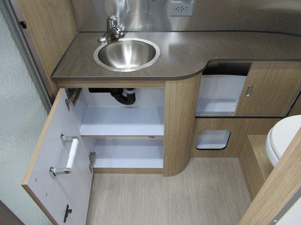 Laminated Galley Top • Sink Cover(s) • S.S. Single Bowl 18” Sink (Double Bowl on 20FB & 23FB) (15.75″ Rectangular Bowl on 19CB) • Faucet w/Separate Sprayer • Aluminum Insert on Refrigerator • Pantry Storage (N/A 28RB) • Bi-Fold Stainless Steel Range Cover • Overhead Rooflocker w/Radius Doors • Cutlery Drawer w/Hardwood Maple Drawer Organizer • Filtered Cold Water.