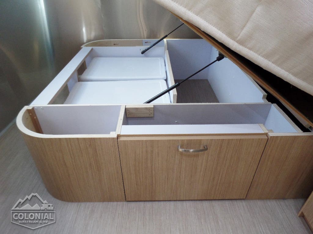Pillow Top Memory Foam Mattress • Quilted Bedspread w/Reverse Sham w/Decorative Throw Pillows • (2) Regular Bed Pillows • Call Colonial Airstream 18887412603 • Removable Under Bed Storage Bins • Sleeping Capacities: 2 – 4 (19CB; 20FB); 2 – 5 (23CB; 25FB, 25RB 27FB) ; 2 – 6 (28RB , & 30RB); 8 (30FB Bunk) • 30 FB Bunk Only Has Corner Double Lower Bed 54″X 76″ w/pillowtop memory foam mattress & single upper bunk 30″X78″ w/quilted mattress /C.S. Wardrobe Sleeping Capacities: 2 – 4 (19CB, 20FB, & 23FB); 2 -5 (23CB, 25FB, 25RB – 27FB); 2 -6 (28RB & 30RB); 2- 8 (30 Bunk).