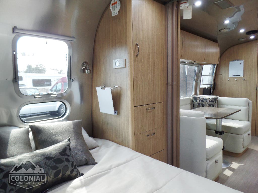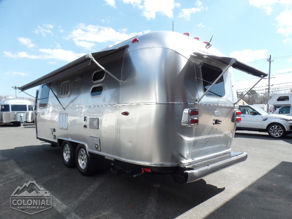 Bright Aluminum Finish / White Aluminum Finish on Roof • Polished Rear Bumper w/Storage • Flying Cloud Medallions & Graphics w/Chrome Beltline & Rub-rail w Inserts • License Plate Bracket w/LED Light • Grab Handle-Cast Aluminum • Aluminum LP Bottle Cover • Enclosed & Insulated Underbelly & Tanks • Dark Grey Patio Awning C.S. • C.S. & R.S. Awning Rails • Solar Stone Guard • Stainless Steel Wrap Protectors • Main Door w/Opaque Window • Call Colonial Airstream 18887412603 • Diamond Plate Exterior Storage Compartment • Cast Taillights – 6” LED Oval • Exterior Shower • Exterior LP Service Port w/Quick Connect Hose & Adapter Fitting • Portal Windows • LED Light Strip on Patio Awning with Dimmer Switch • Wireless Backup/Driving Camera W/Monitor.