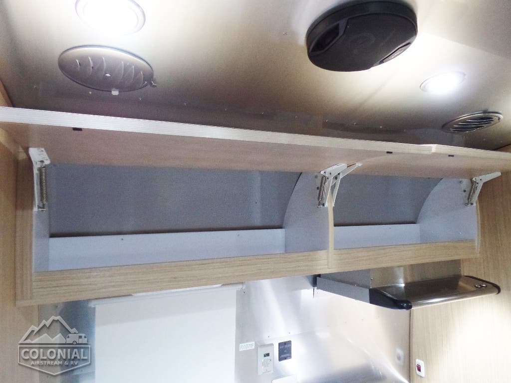 Pull Roller Shades on All Windows except Drapes on Panoramic Windows (N/A 30FB) • Bright Aluminum Finish Interior Skin • Wood drawer boxes w/ full extension, self closing ball-bearing drawer glides • Overhead Rooflockers w/ Radius Doors • Entrance Mat w/Airstream Logo • Grab Handle • Vinyl Flooring Throughout • Call Colonial Airstream 18887412603 • Satin Finish Hardware • Curtains W/Blackout Linings • 5-Hook Key Holder • LED Ceiling Lights • Magazine Rack (N/A 27FB)• Laminate Furniture & Countertops.