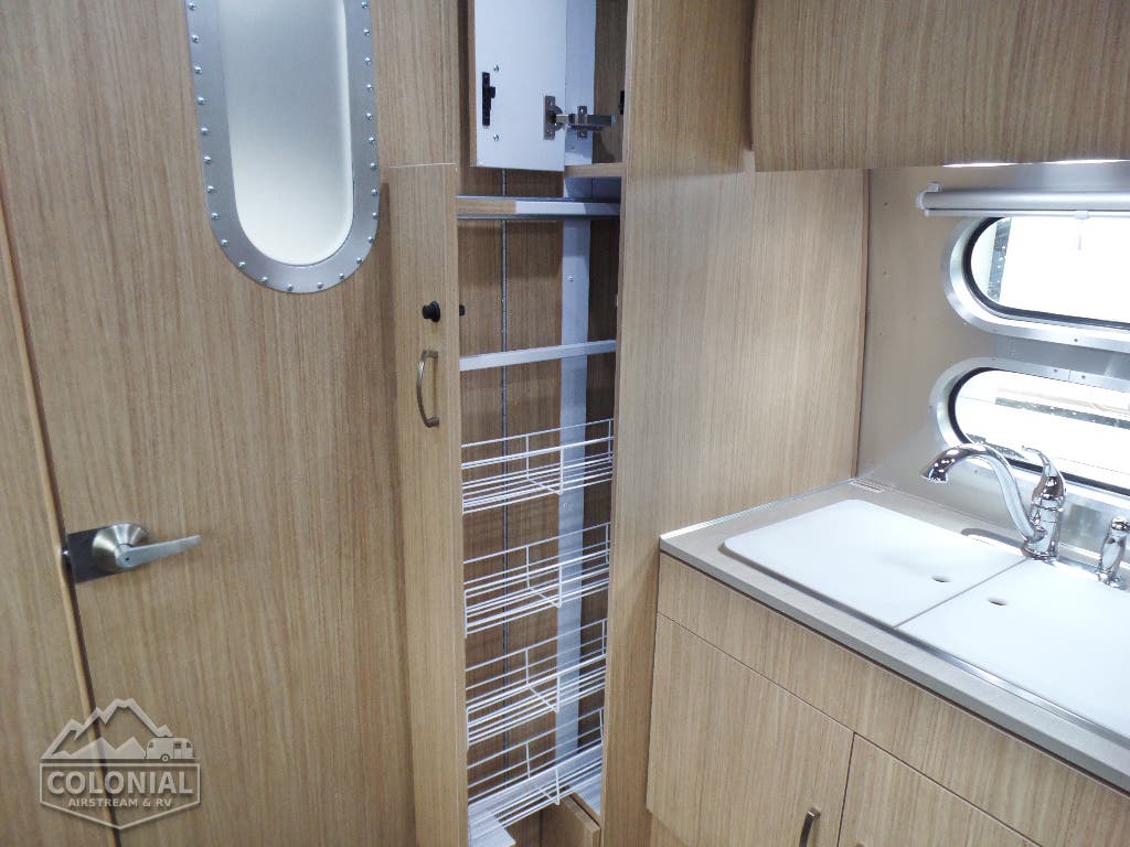 Bright Aluminum Finish / White Aluminum Finish on Roof • Polished Rear Bumper w/Storage • Flying Cloud Medallions & Graphics w/Chrome Beltline & Rub-rail w Inserts • License Plate Bracket w/LED Light • Grab Handle-Cast Aluminum • Aluminum LP Bottle Cover • Enclosed & Insulated Underbelly & Tanks • Dark Grey Patio Awning C.S. • C.S. & R.S. Awning Rails • Solar Stone Guard • Stainless Steel Wrap Protectors • Main Door w/Opaque Window • Call Colonial Airstream 18888679654 • Diamond Plate Exterior Storage Compartment • Cast Taillights – 6” LED Oval • Exterior Shower • Exterior LP Service Port w/Quick Connect Hose & Adapter Fitting • Portal Windows • LED Light Strip on Patio Awning with Dimmer Switch • Wireless Backup/Driving Camera W/Monitor.