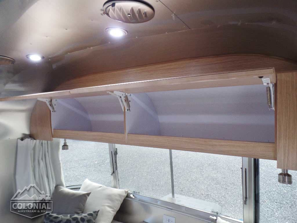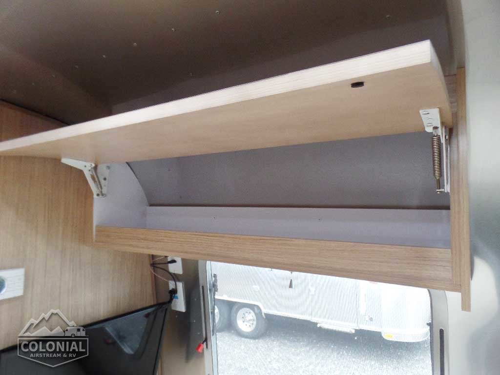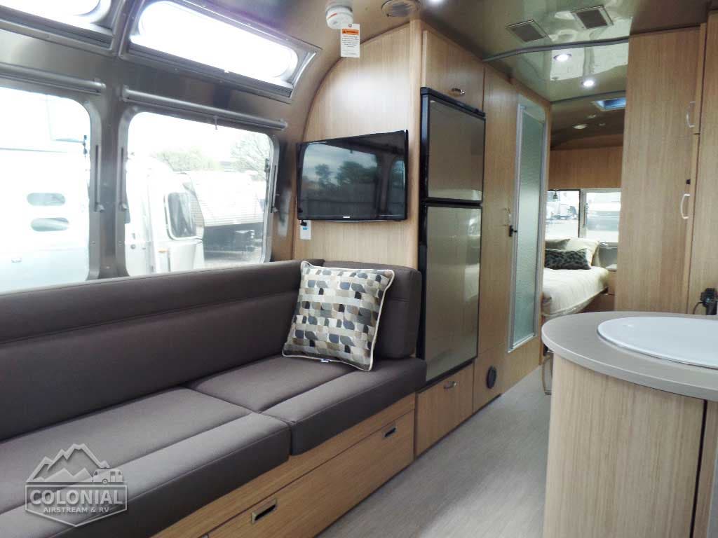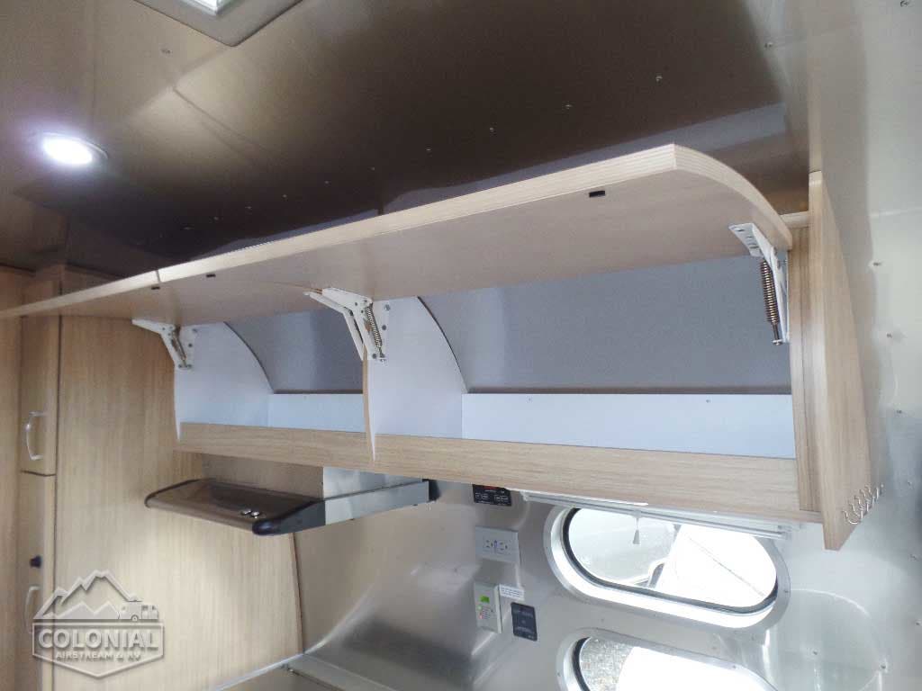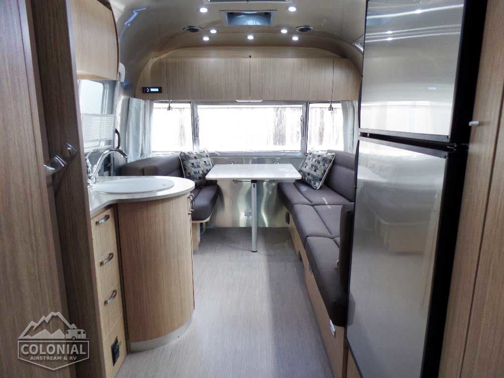 Pull Roller Shades on All Windows except Drapes on Panoramic Windows (N/A 30FB) • Bright Aluminum Finish Interior Skin • Wood drawer boxes w/ full extension, self closing ball-bearing drawer glides • Overhead Rooflockers w/ Radius Doors • Entrance Mat w/Airstream Logo • Grab Handle • Vinyl Flooring Throughout • Call Colonial Airstream 18776111615 • Satin Finish Hardware • Curtains W/Blackout Linings • 5-Hook Key Holder • LED Ceiling Lights • Magazine Rack (N/A 27FB)• Laminate Furniture & Countertops.