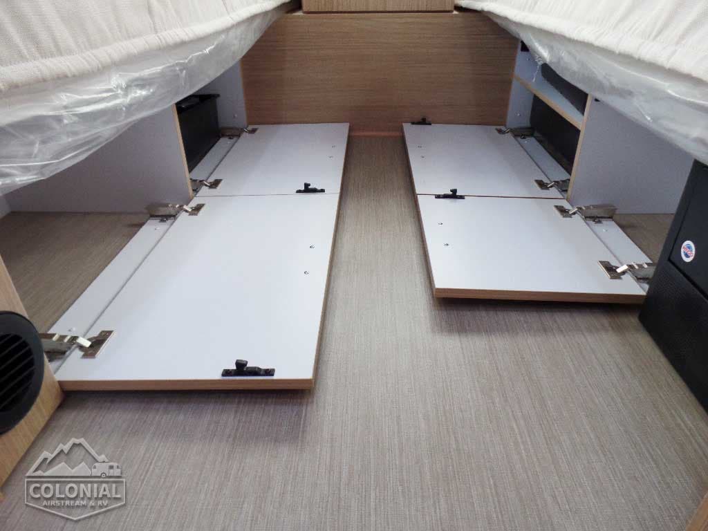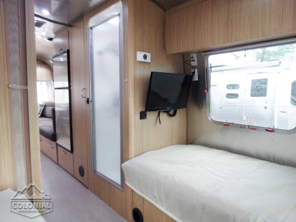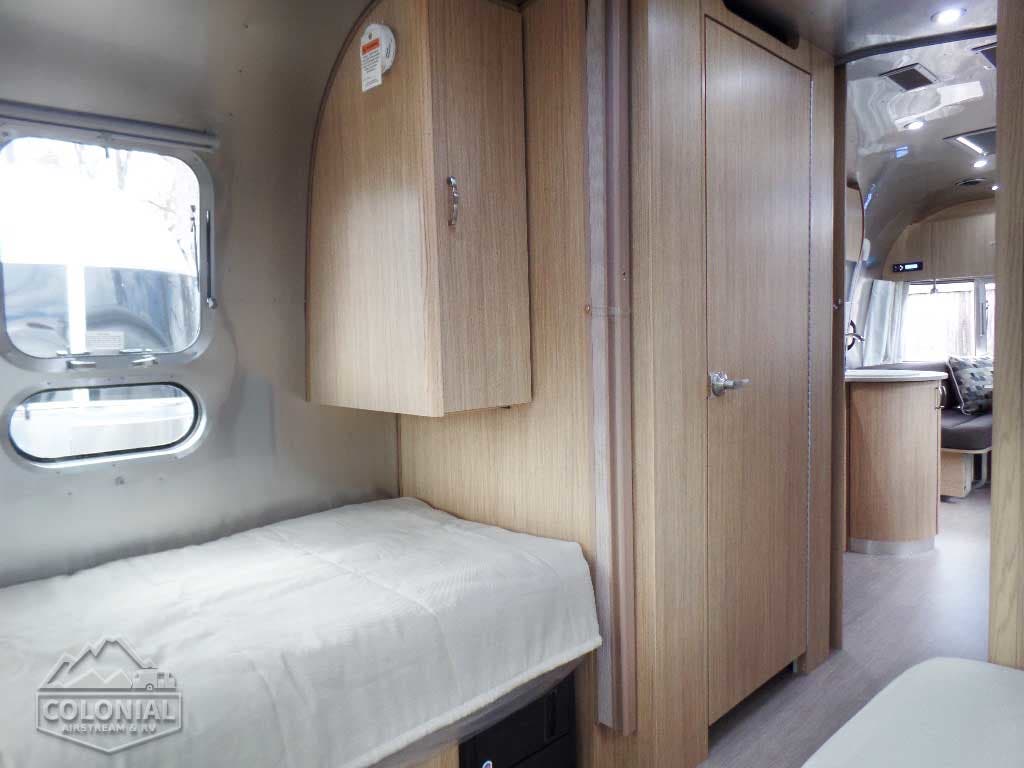 Pillow Top Memory Foam Mattress • Quilted Bedspread w/Reverse Sham w/Decorative Throw Pillows • (2) Regular Bed Pillows • Call Colonial Airstream 18776111615 • Removable Under Bed Storage Bins • Sleeping Capacities: 2 – 4 (19CB; 20FB); 2 – 5 (23CB; 25FB, 25RB 27FB) ; 2 – 6 (28RB , & 30RB); 8 (30FB Bunk) • 30 FB Bunk Only Has Corner Double Lower Bed 54″X 76″ w/pillowtop memory foam mattress & single upper bunk 30″X78″ w/quilted mattress /C.S. Wardrobe Sleeping Capacities: 2 – 4 (19CB, 20FB, & 23FB); 2 -5 (23CB, 25FB, 25RB – 27FB); 2 -6 (28RB & 30RB); 2- 8 (30 Bunk).