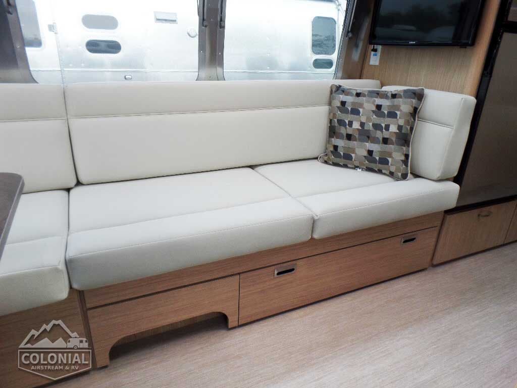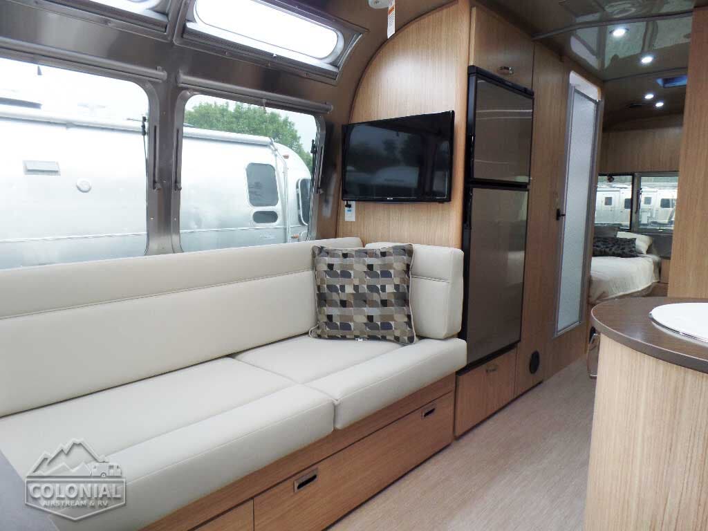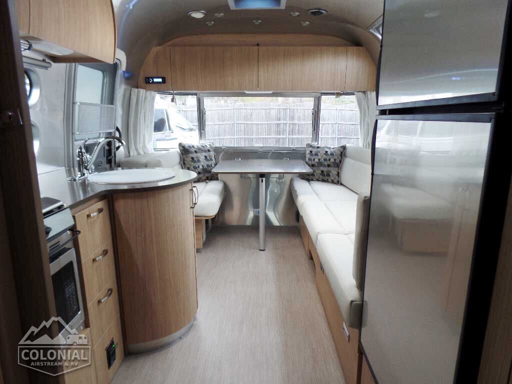 Pull Roller Shades on All Windows except Drapes on Panoramic Windows (N/A 30FB) • Bright Aluminum Finish Interior Skin • Wood drawer boxes w/ full extension, self closing ball-bearing drawer glides • Overhead Rooflockers w/ Radius Doors • Entrance Mat w/Airstream Logo • Grab Handle • Vinyl Flooring Throughout • Call Colonial Airstream 18776581861 • Satin Finish Hardware • Curtains W/Blackout Linings • 5-Hook Key Holder • LED Ceiling Lights • Magazine Rack (N/A 27FB)• Laminate Furniture & Countertops.