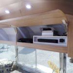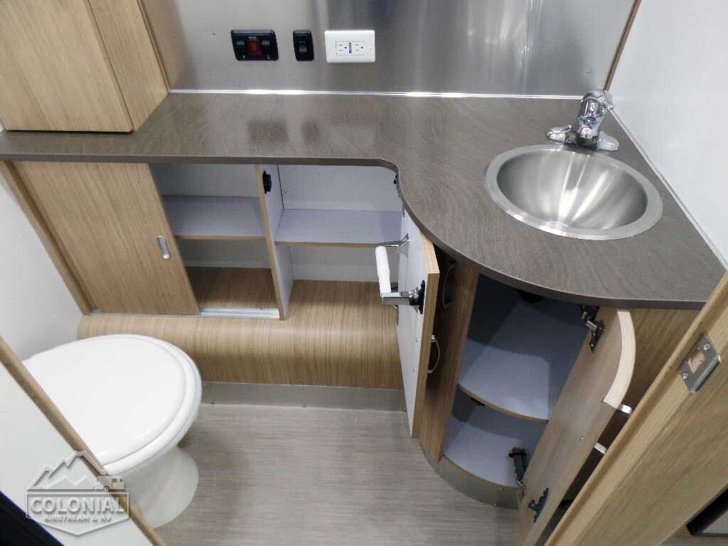 Laminated Galley Top • Sink Cover(s) • S.S. Single Bowl 18” Sink (Double Bowl on 20FB & 23FB) (15.75″ Rectangular Bowl on 19CB) • Faucet w/Separate Sprayer • Aluminum Insert on Refrigerator • Pantry Storage (N/A 28RB) • Bi-Fold Stainless Steel Range Cover • Overhead Rooflocker w/Radius Doors • Cutlery Drawer w/Hardwood Maple Drawer Organizer • Filtered Cold Water.
