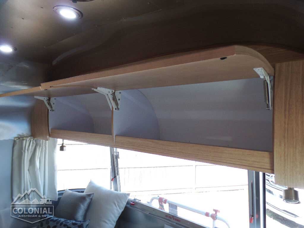Pull Roller Shades on All Windows except Drapes on Panoramic Windows (N/A 30FB) • Bright Aluminum Finish Interior Skin • Wood drawer boxes w/ full extension, self closing ball-bearing drawer glides • Overhead Rooflockers w/ Radius Doors • Entrance Mat w/Airstream Logo • Grab Handle • Vinyl Flooring Throughout • Call Colonial Airstream 18776581861 • Satin Finish Hardware • Curtains W/Blackout Linings • 5-Hook Key Holder • LED Ceiling Lights • Magazine Rack (N/A 27FB)• Laminate Furniture & Countertops.